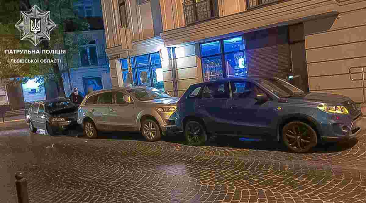Як розповіли в патрульній поліції Львівщини, 27-річний водій автомобіля Renault Megane не впорався з керуванням та здійснив наїзд на припарковану автівку Audi Q7, яка за інертним рухом в’їхала в авто попереду Suzuki Vitara.