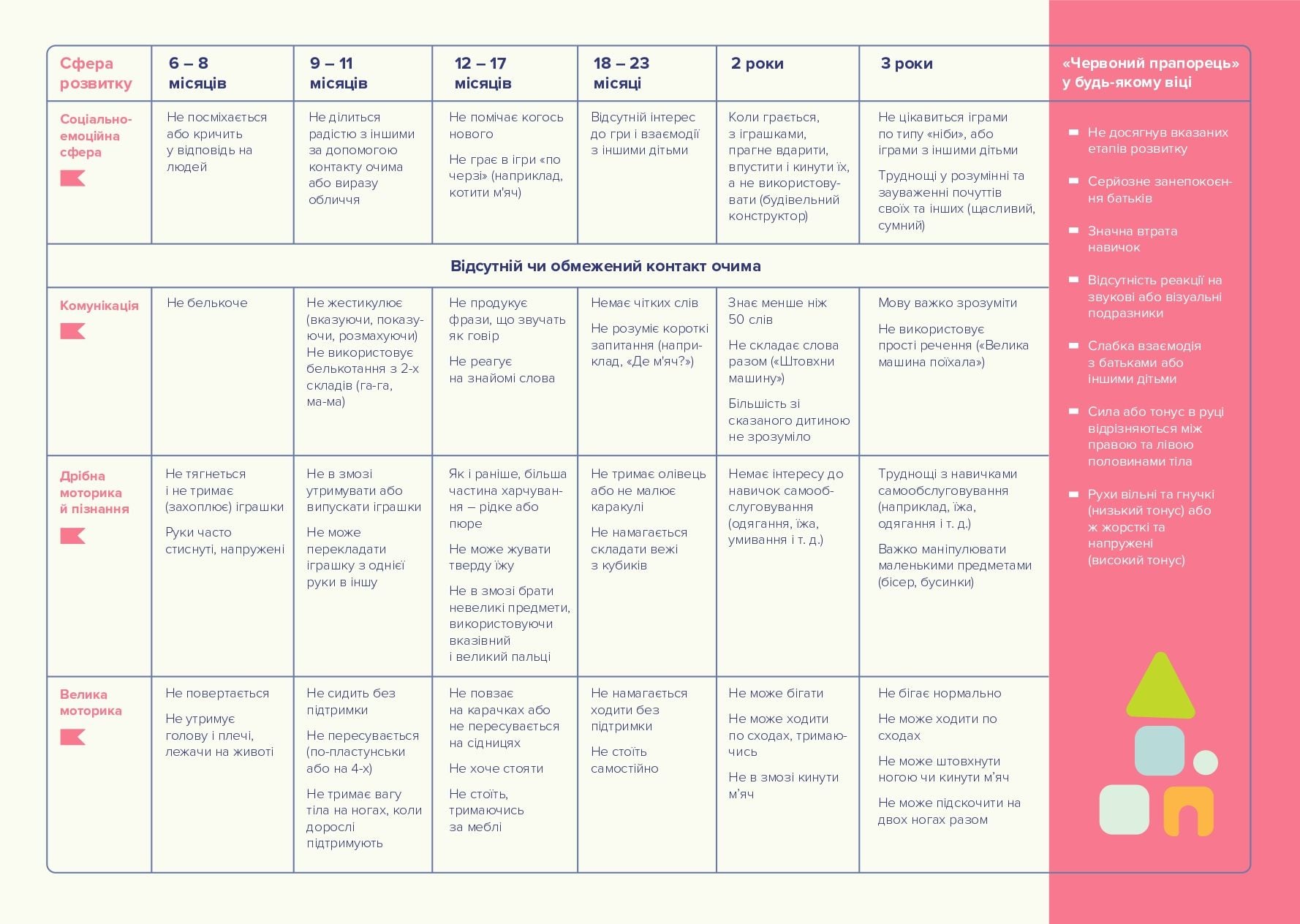 Одним із доступних інструментів, який допоможе помітити можливі затримки розвитку в різних сферах: соціально-емоційній, комунікації, великій і дрібній моториці, є таблиця «Червоні прапорці».