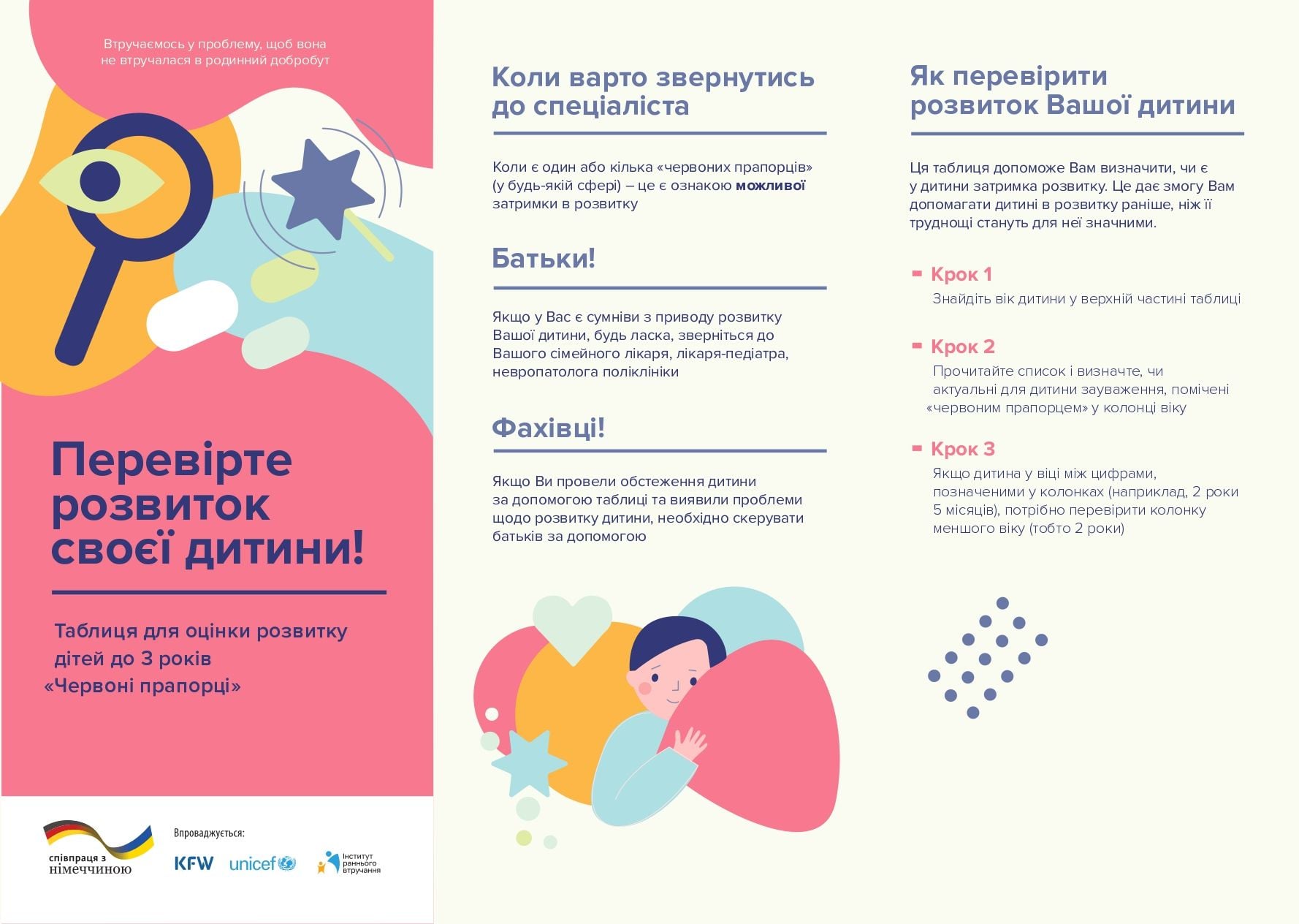 Ми також долучаємо інформаційну брошуру з «червоними прапорцями розвитку», яка допоможе батькам самостійно спостерігати за розвитком дитини.