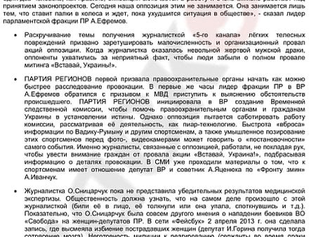 Згідно з інформацією видання, у "записці" регіоналам виписали рекомендації, як потрібно коментувати побиття кореспондентки 5 каналу Ольги Сніцарчук та фотографа "Коммерсанту" Влада Соделя.