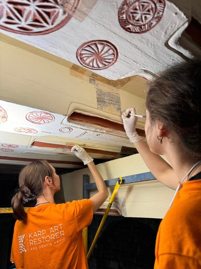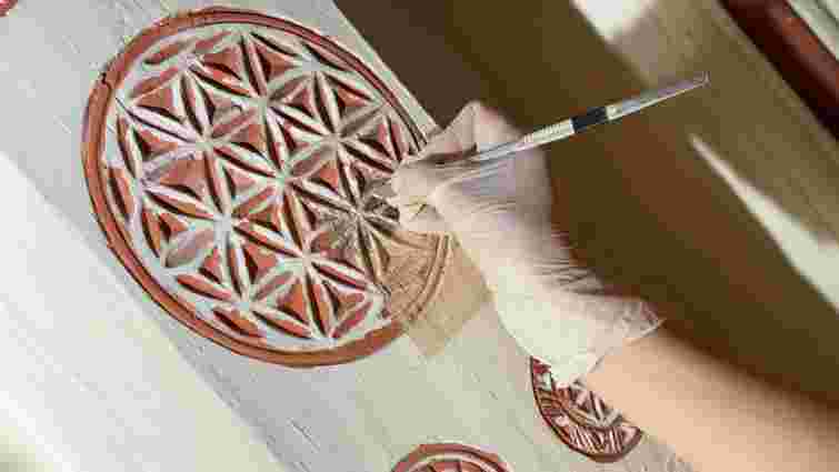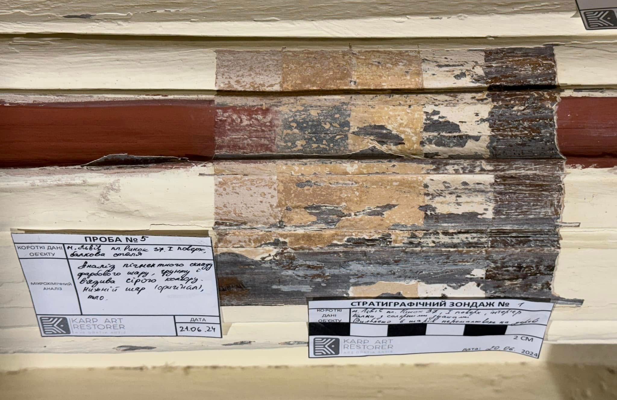 «На момент початку досліджень центральна частина балок і всі дошки між ними були вкриті кількома шарами пізніших перемальовувань. Значна частина поверхонь зазнала грубого втручання в минулому – попередні очищення призвели до пошкодження деревини та втрати історичних шарів. З архівної документації інституту “Укрпроектреставрація” відомо про відновлення поліхромії балкової стелі та інших елементів інтер’єру. Історично перемальовування мало не лише естетичну, а й практичну мету: оновлювали вигляд стелі та намагались продовжити її “життєвий цикл”. Окремі ділянки деревини мають сліди смолянистих покриттів, які, ймовірно, застосовувались для консервації», – розповідають у майстерні.