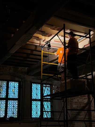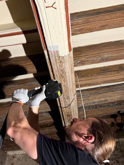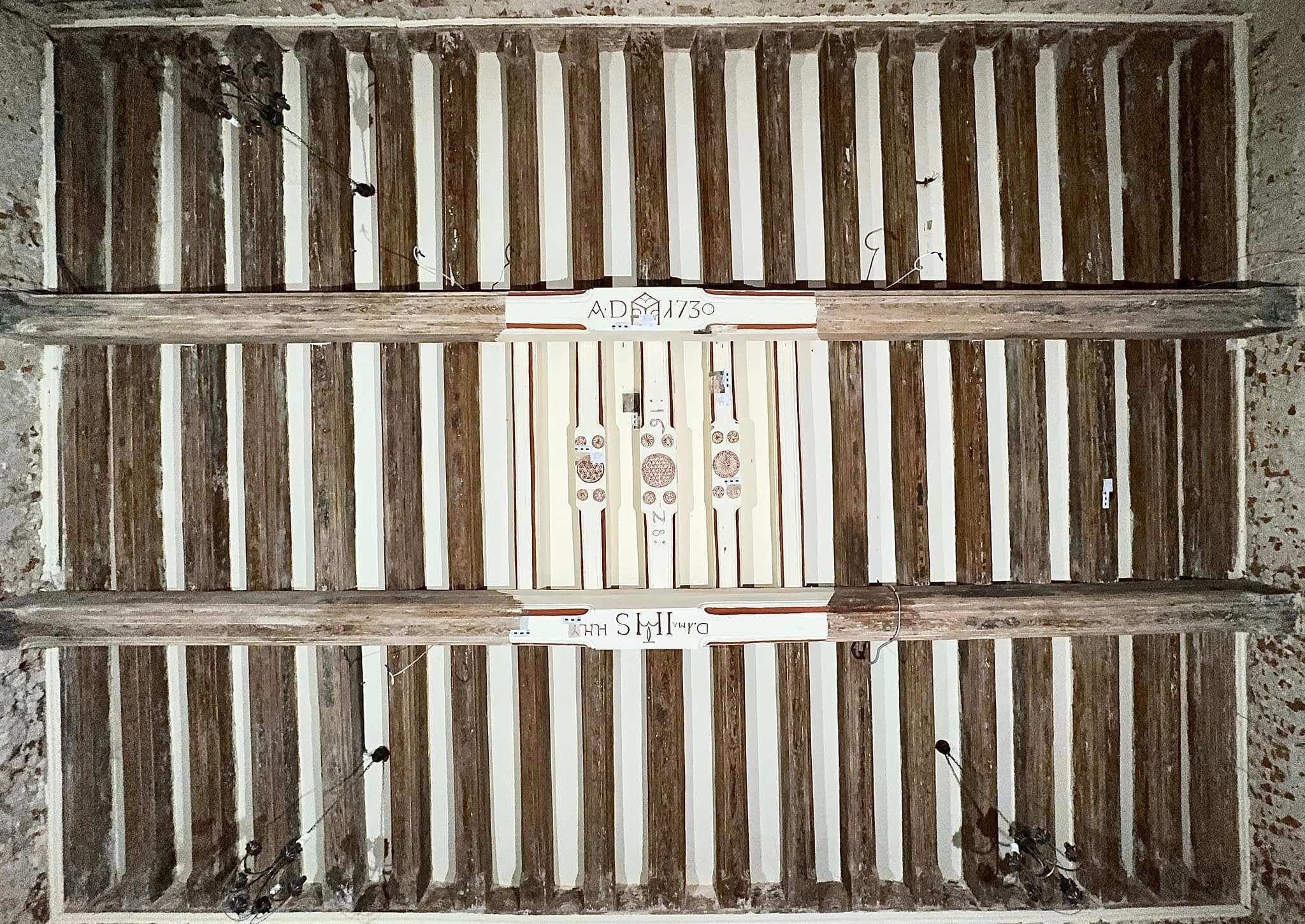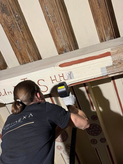 Фахівці Karp Restorer провели комплексні дослідження стелі, де збереглися автентичні дерев’яні балки, датовані 1628 та 1730 роками, на них помітні оригінальні різьбленні маркування та солярні знаки.
