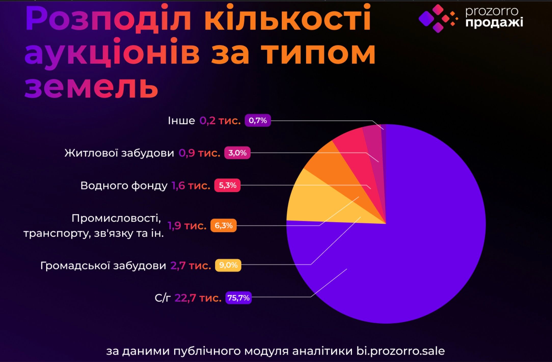 З моменту запуску земельних аукціонів у системі «Прозорро.Продажі» у листопаді 2021 року в Україні продали або здали в оренду понад 30 тисяч земельних ділянок. Сукупна вартість угод за цей час сягнула майже 8 млрд грн – це ціна продажу та щорічної оренди земель різного призначення, повідомили у «Прозорро.Продажі».