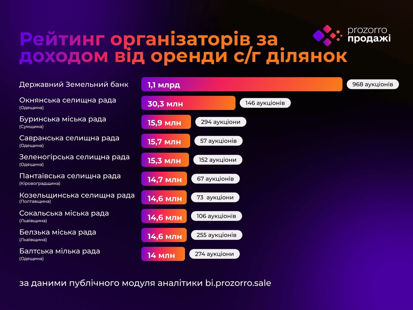 До проведення торгів долучилися понад 3 тисячі організаторів – це і територіальні громади, і державний «Земельний банк», і приватні виконавці та власники ділянок. Більшість угод стосувалися земель сільськогосподарського призначення. Лідером за доходами став державний «Земельний банк», який провів майже тисячу аукціонів. Переможці цих торгів щороку сплачують близько 1,1 млрд грн до державного та місцевих бюджетів.