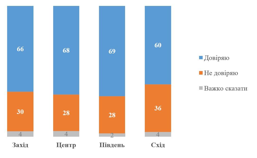 Рівень довіри до Зеленського трохи нижчий у східних областях України, там президенту довіряють 60% довіряють і 36% не довіряють. Водночас у центральних, західних та південних регіонах цей показник становить 66-69%. Фахівці зауважують, що баланс довіри-недовіри є позитивним у всіх регіонах країни.
