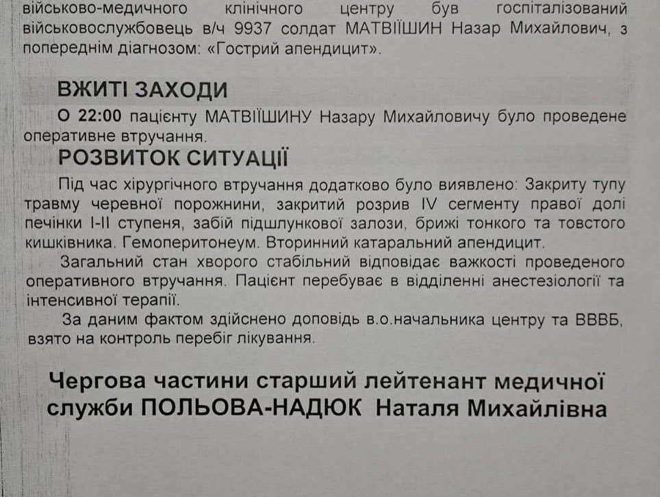 З її слів, 26 червня Назар Матвіїшин потрапив у Львівський клінічний госпіталь ДПСУ із діагнозом гострий апендицит, але під час операції лікарі також виявили сильні пошкодження внутрішніх органів. За висновком лікарів, який оприлюднила сестра, у солдата виявили закриту тупу травму черевної порожнини, закритий розрив печінки, забій підшлункової залози, брижі тонкого та товстого кишківника.