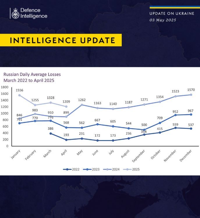 Генштаб ЗСУ повідомляв, що середньодобові втрати росіян у квітні 2025 року становили трохи більше як 1200 людей, загалом протягом місяця – 36 тис. солдатів. У березні середньодобові втрати Росії були приблизно 1300 військових.