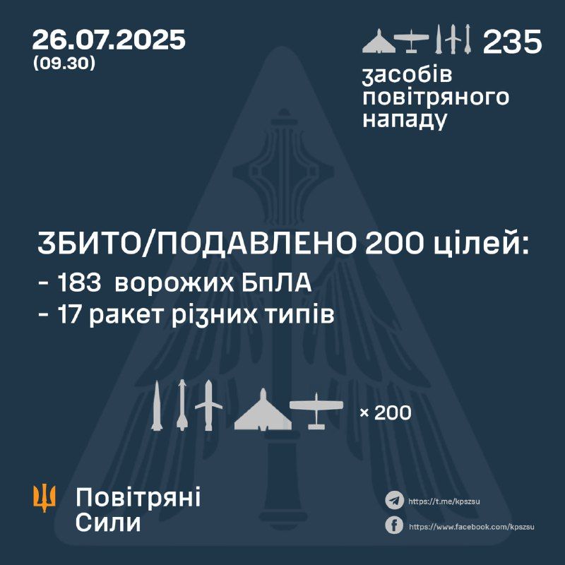 З 20:00 25 липня РФ запустила загалом 235 засобів повітряного нападу, а саме: