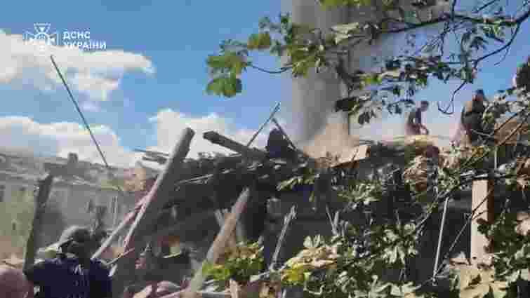 На відео, опублікованому президентом, видно, як рятувальники та місцеві мешканці розбирають завали будівлі, під якими є люди. Споруда, в яку влетіла російська ракета, знищена.