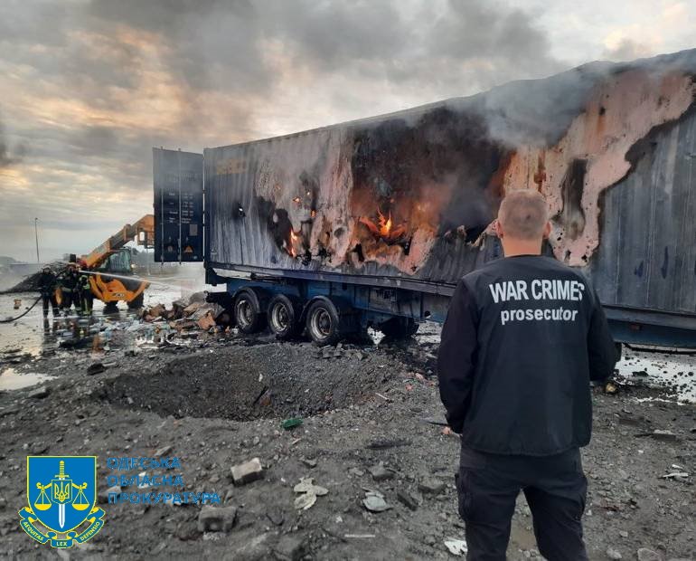 За даними Офісу Генпрокурора, під час нічної атаки росіяни пошкодили припортову та прикордонну інфраструктуру. Зокрема, йдеться про зерносховища та адміністративні будівлі у порту Рені, а також дев’ять вантажівок, які згоріли вщент.