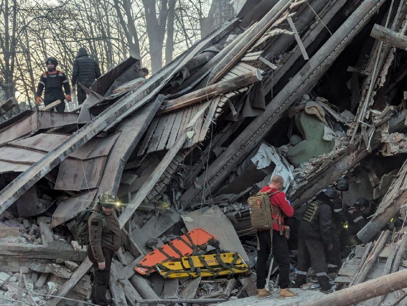 Як повідомили у ДСНС, росіяни влучили у чотириповерховий будинок. Удар зруйновав під’їзд з 1 по 4 поверх.