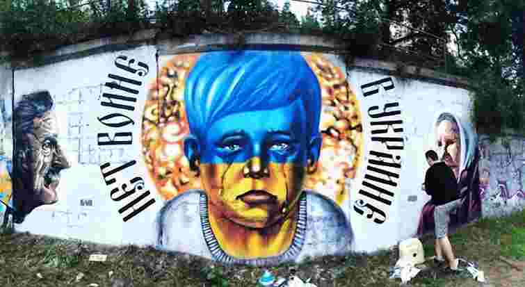 Обличчя дитини розфарбоване кольорами українського прапора, а за його спиною - вогняна маса. Навколо зображення - напис «Ні війні в Україні», а по боках - зображення дорослих, які спостерігають. Про це пише Остров.ру.