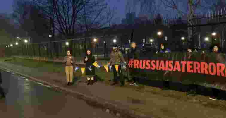 Активісти прийшли під дипломатичну установу з плакатами «Fuck Putin» і «Russia is a terrorist state».