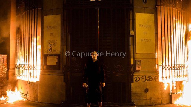 Фото Павленського, який стоїть на фоні палаючої будівлі Банку Франції, опублікував фотограф Капуцин Анрі.