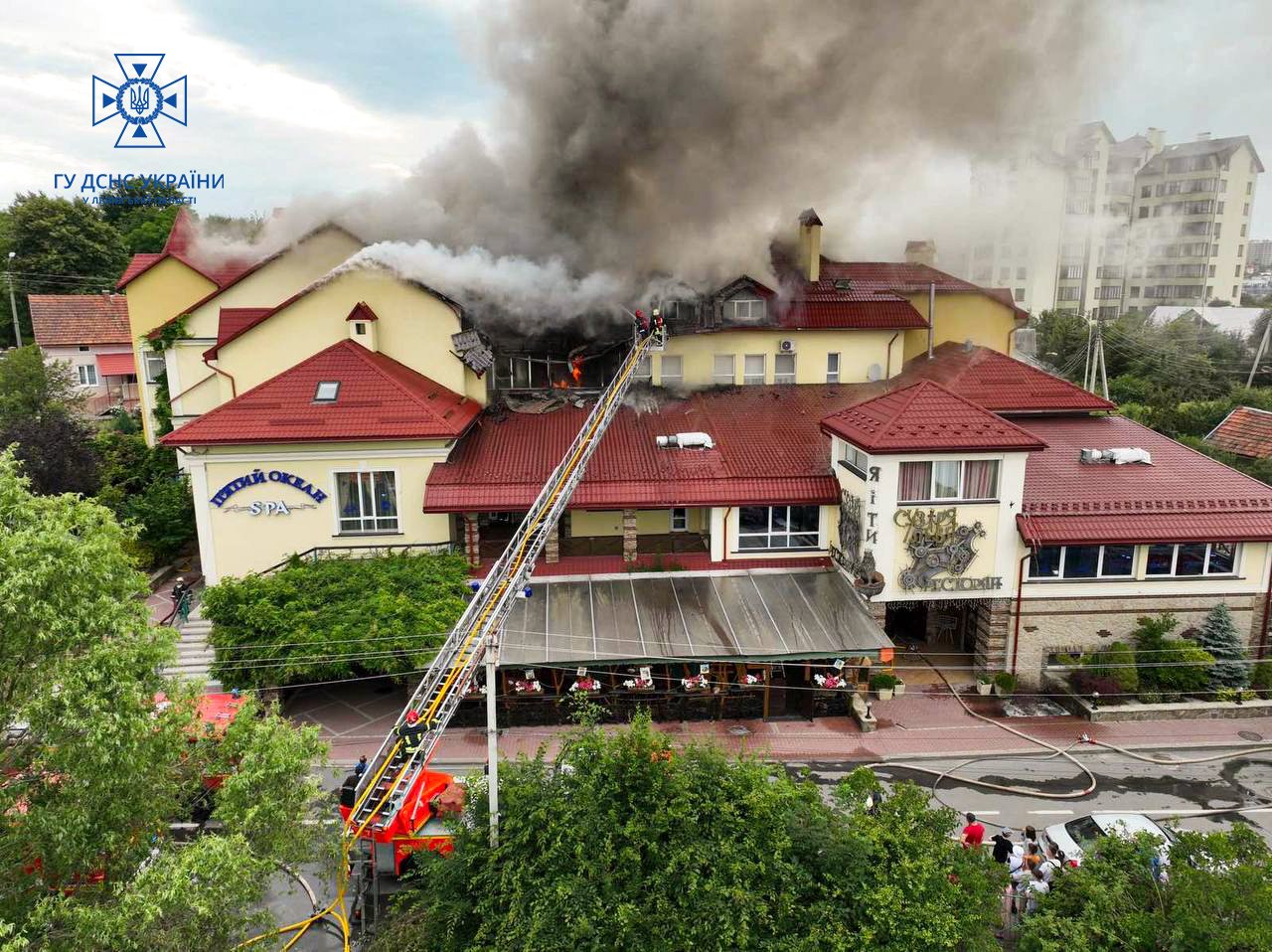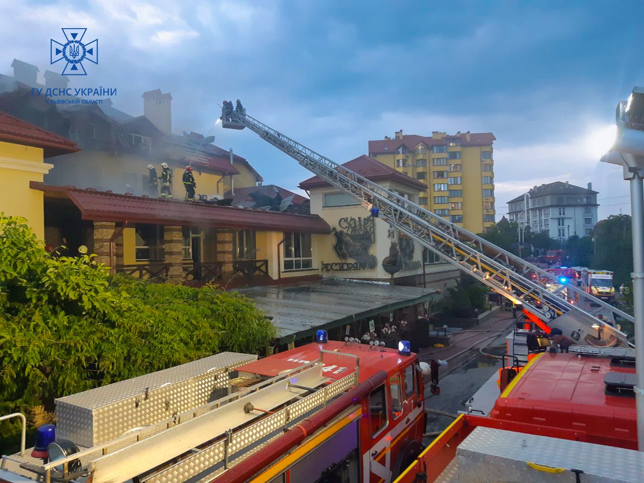 «12 липня о 17:14 до Служби порятунку надійшло повідомлення про пожежу. До місця події було направили рятувальників Львівщини за підвищеним номером виклику. Наразі рятувальники ліквідовують займання даху будівлі», – повідомили у ДСНС.