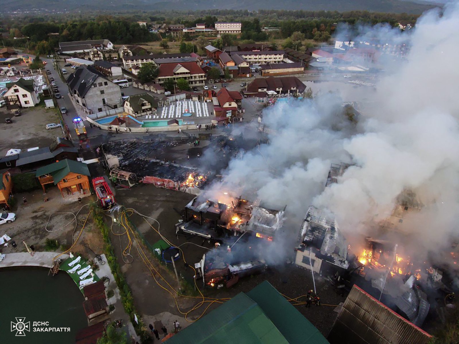 У неділю, 8 вересня, у селищі Солотвино Тячівського району загорілися дерев’яні будинки на турбазі «Кредо». Відпочивальники евакуювалися самостійно. Пожежу гасили 30 рятувальників за допомогою 6 одиниць техніки.