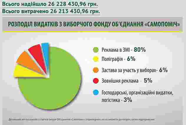 Усі дані у фінансовому звіті «Самопомочі» вказані станом на 20 жовтня. Загальна сума отриманих коштів склала понад 26,2 млн грн., з яких 80% було витрачено на передвиборчу рекламу у ЗМІ.