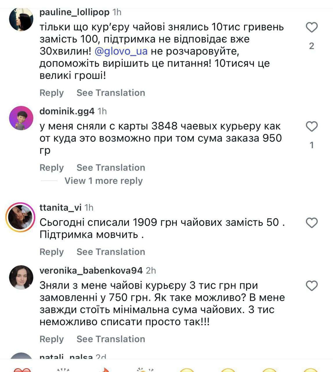 Інші користувачі також повідомляють про випадки списання грошей без їх згоди. Суми чайових сягають понад 10 тис. грн, хоча клієнти вказували значно меншу суму. Згодом користувачі повідомили, що у службі підтримки їм запропонували часткове повернення коштів або бонуси у застосунку на майбутні замовлення.