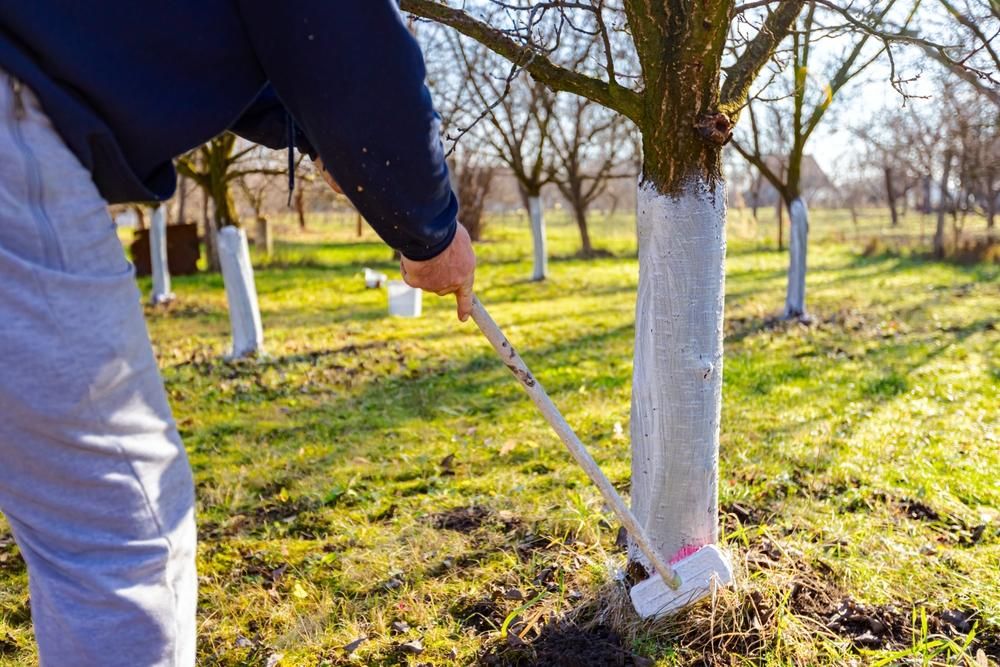 Ще одна обов’язкова процедура – побілка стовбурів. Вона захищає кору від морозобоїн, сонячних опіків та шкідників. Перед нанесенням розчину важливо очистити стовбури від старої кори та моху.