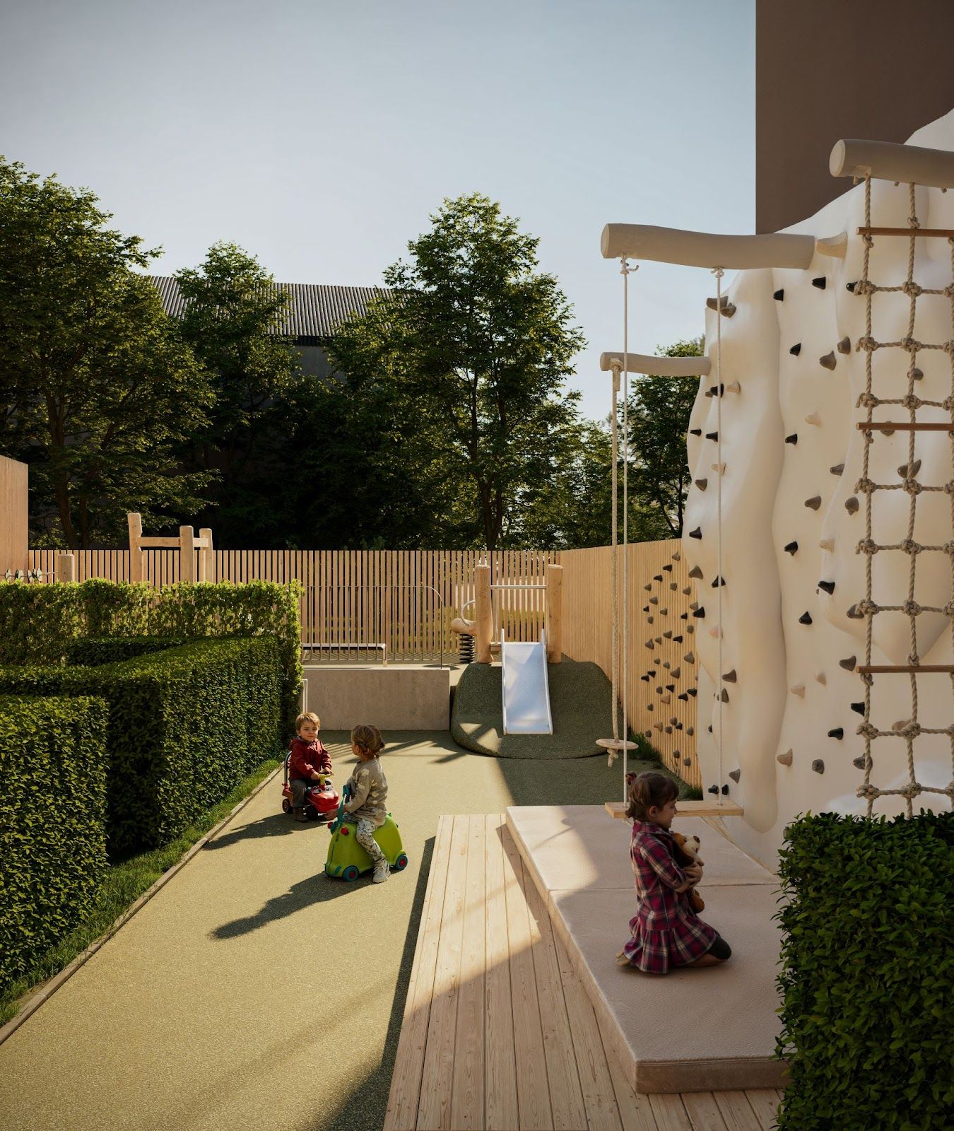 Водночас відпочинкова зона зі зручними садовими кріслами, столиком та видом на сад буде відгороджена від ігрового майданчика, щоб забезпечити комфорт тим, хто захоче почитати книгу чи просто насолодитись розмовою з близькими людьми. Це ідеальний простір, щоб випити келих лимонаду та прийняти сонячні ванни.