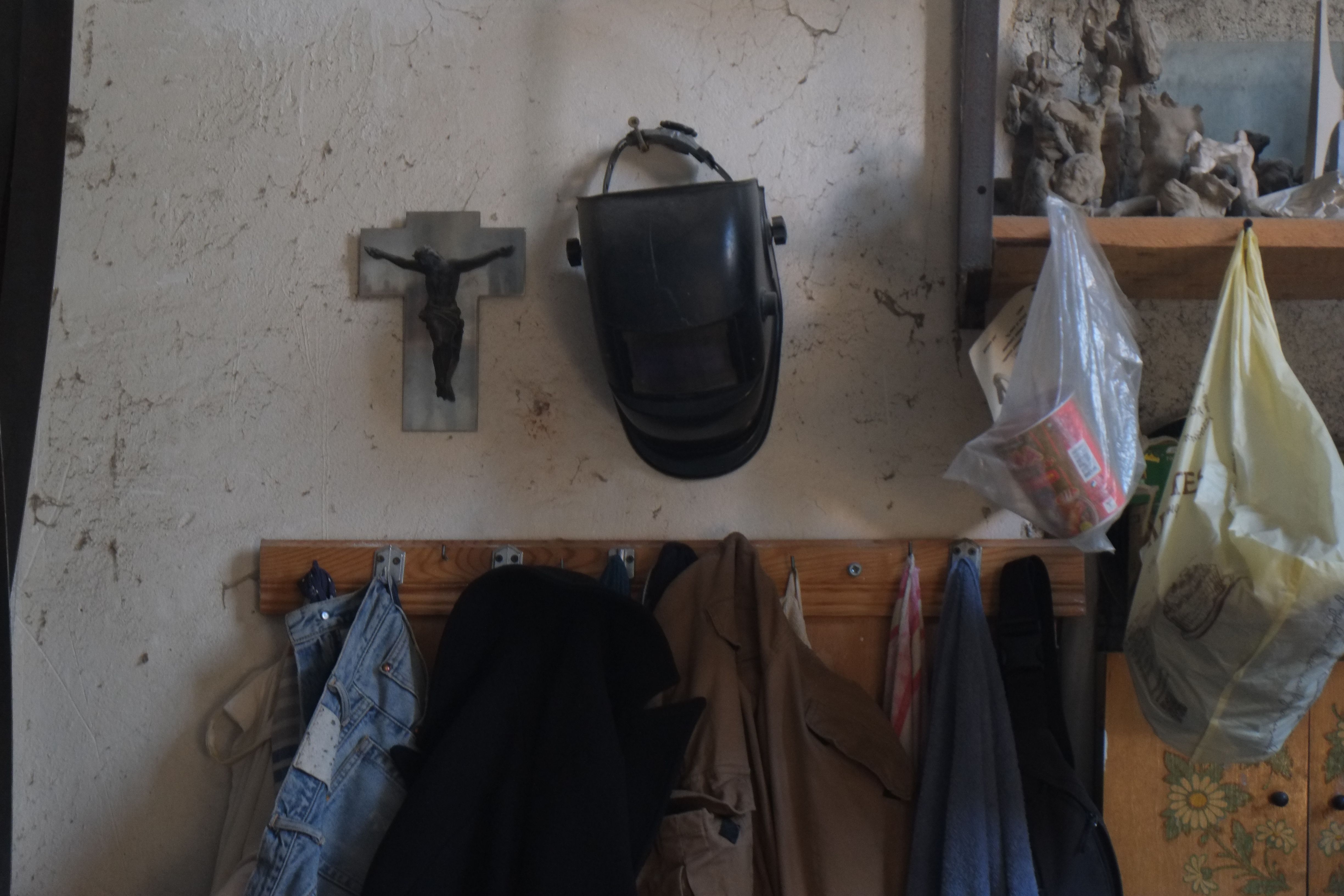 Прошу його почуватися вільно та розповісти більше про те, чим наповнений простір. Крім різних артефактів на полицях, тут, очевидно, ще робочі місця митців. Під стінами стоять величезні столи, на яких гамузом в творчому впорядкованому хаосі лежить мистецький реманент, всілякі інструменти, газові пальники, затискачі, в кутку стоїть велика піч.