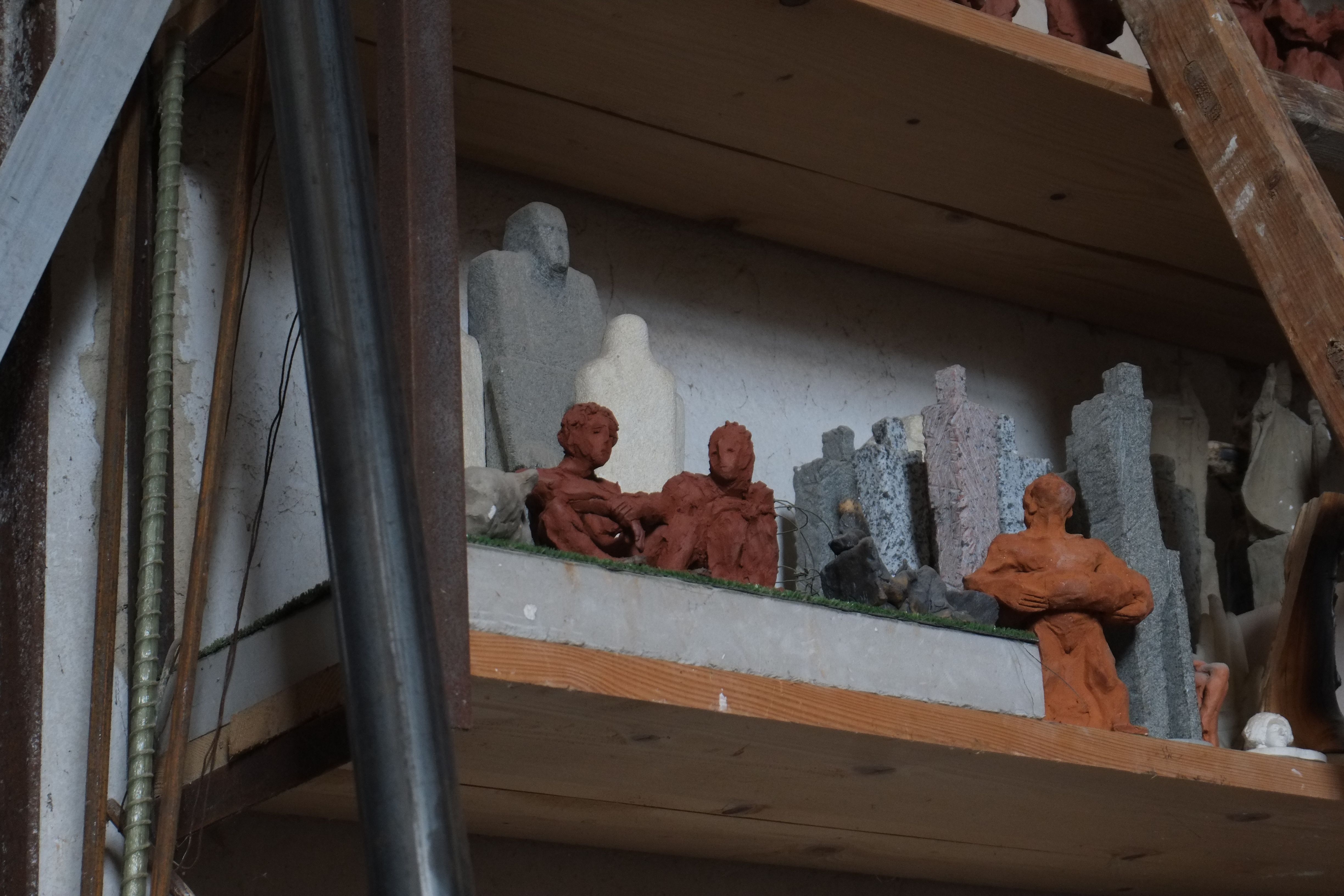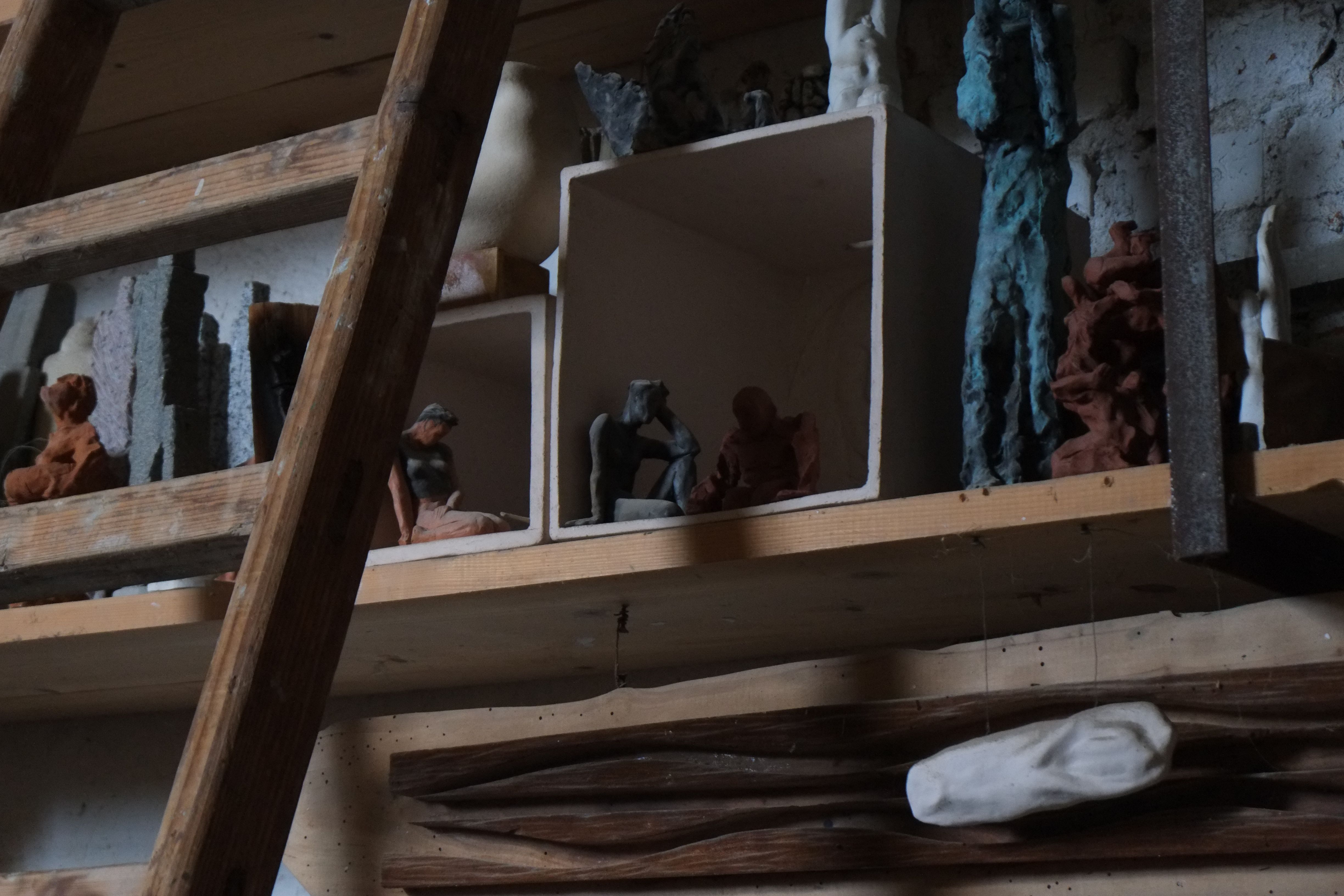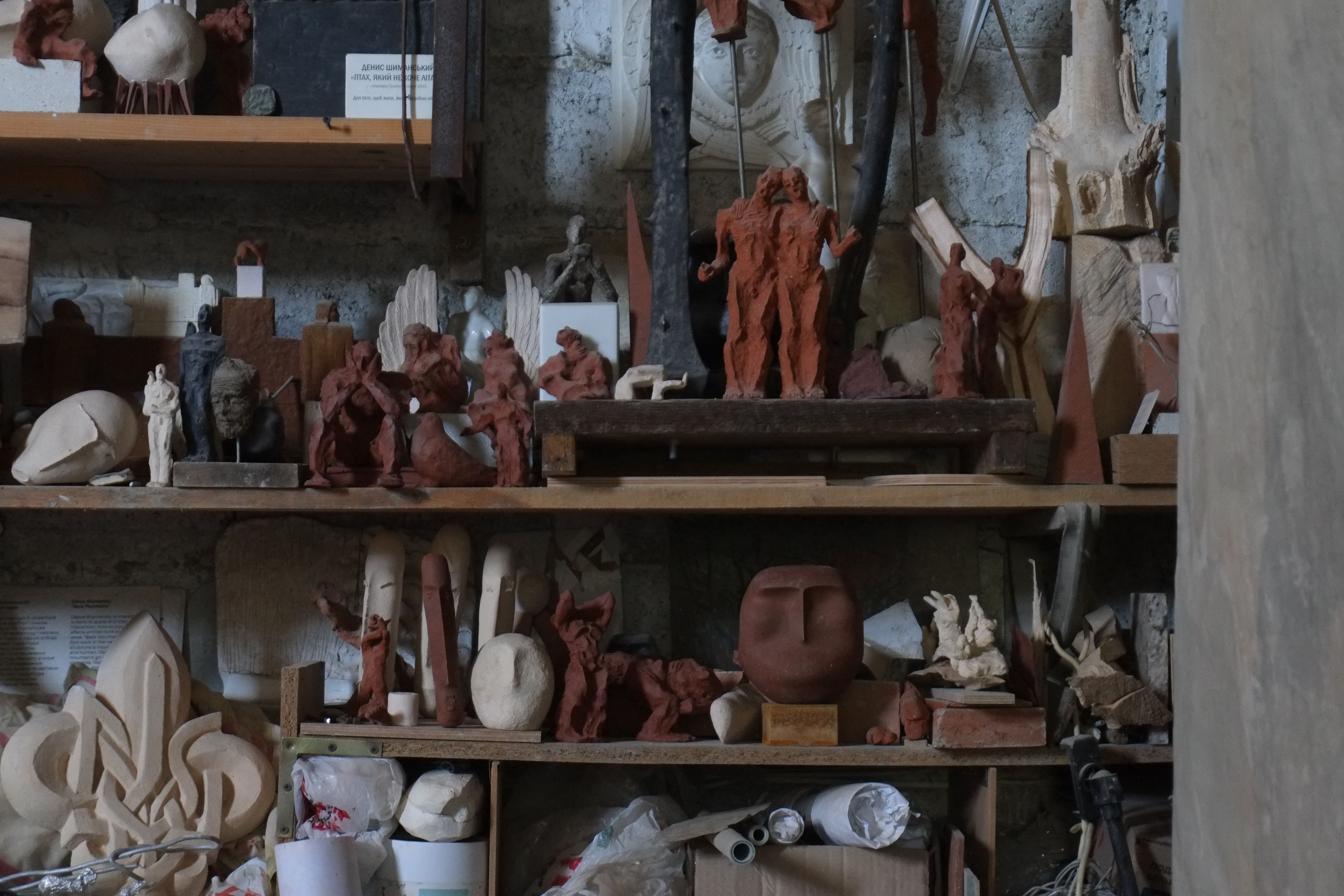 «В цьому куточку роботи Володі до зеленої Кассандри, далі мої. Тут фігурки з проєкту в Палаці мистецтв і ескізи, з яких усе починалося. Маленьке поступово виростає методом проб, помилок і експериментів. Тут також трохи живопису художника Стаса Жалобнюка з Одеси: ми бартеруємо – він нам живопис, ми йому скульптуру», – розповідає Денис Шиманський.