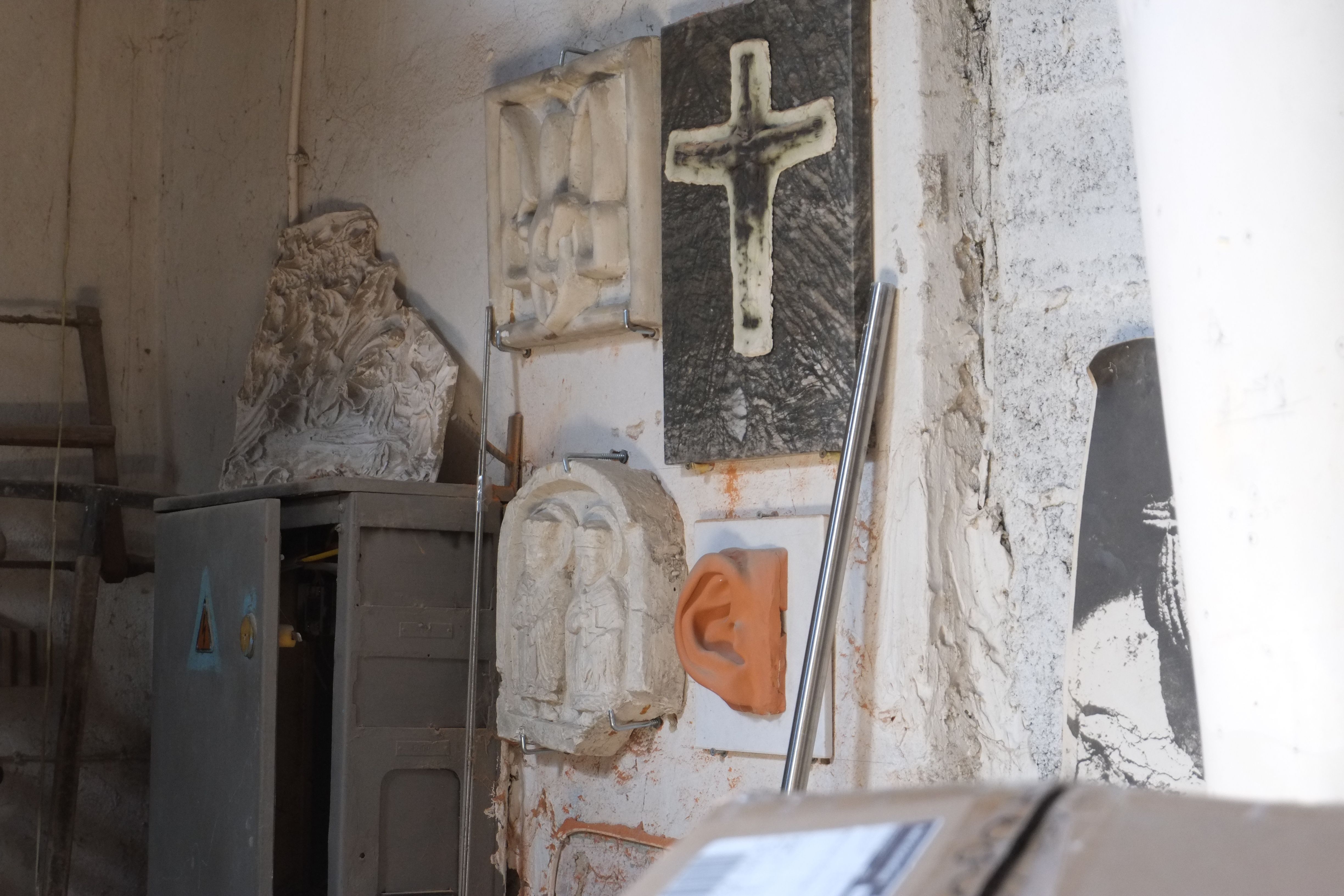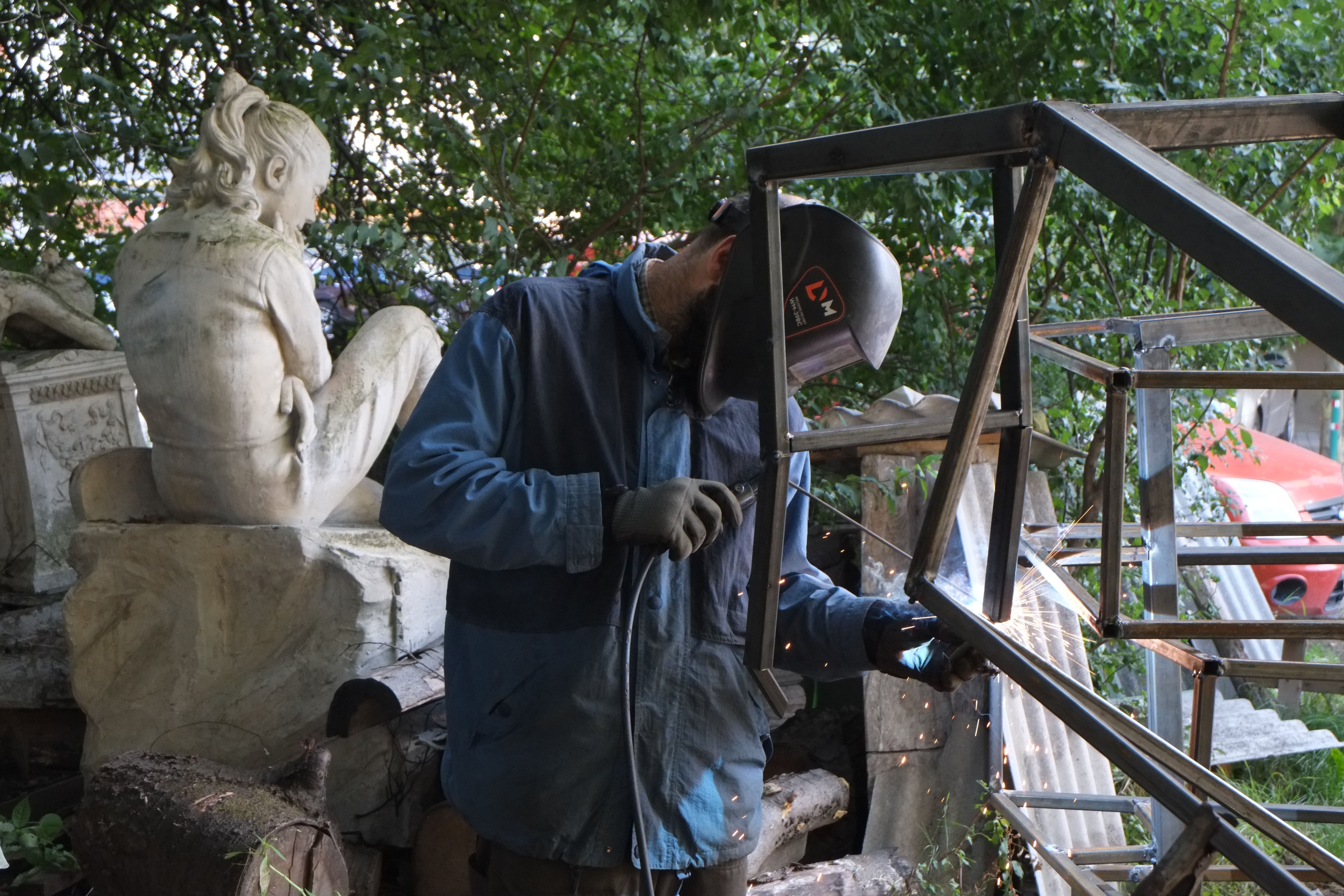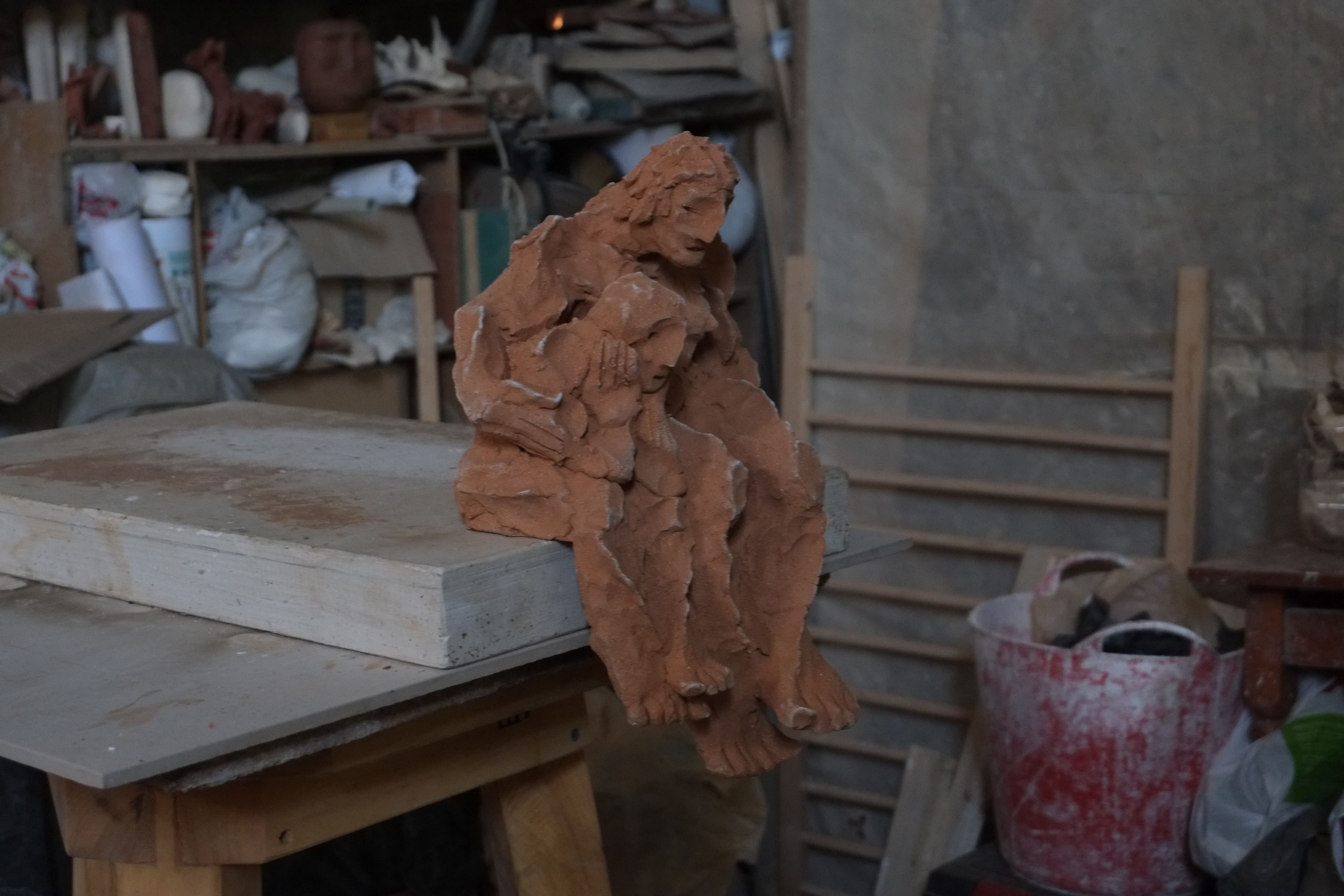 «Колись була котельня, і вона була просто закрита. Вікна були замуровані, бо тут був просто ніби склад. У 2016 році УКУ замовило у Володі Семківа проєкт з руками і він шукав місце, де йому можна було би ліпити ескізи. Тоді ми й знайшли цю майстерню і відтоді тут і працюємо», – розповідає він.