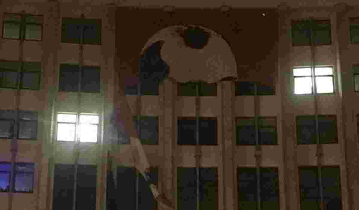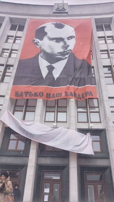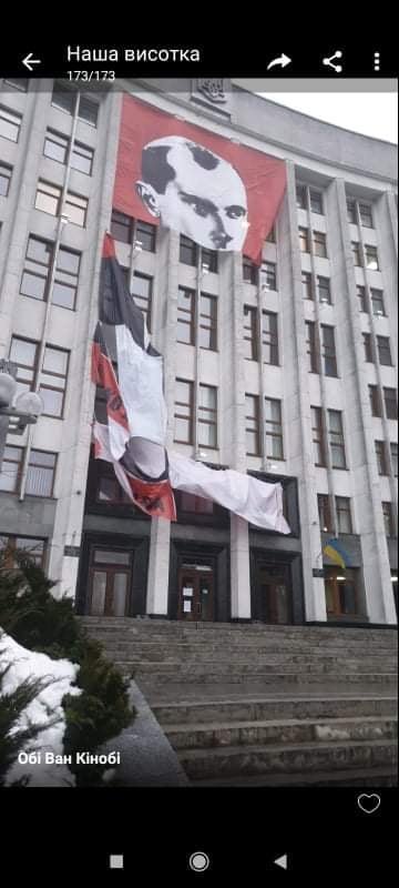 Через негоду і шквальний вітер у Тернополі пошкодився банер з портретом Степана Бандери, розташований на будівлі облради. Частину банера розірвало ще в обід 14 січня, однак працівники облради не могли зняти банер через негоду.