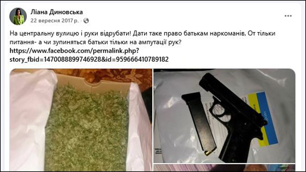 Додамо, що у 2017 році Ліана Диновська опублікувала допис у фейсбуці, в якому прокоментувала новину Департаменту внутрішньої безпеки Нацполіції про викриття організованої групи, яка займалася виробництвом та збутом наркотиків у місті Дубровиця на Рівненщині. Тоді посадовиця написала наступне: «На центральну вулицю і руки відрубати! Дати таке право батькам наркоманів, от тільки питання: а чи зупиняться батьки тільки на ампутації рук?»