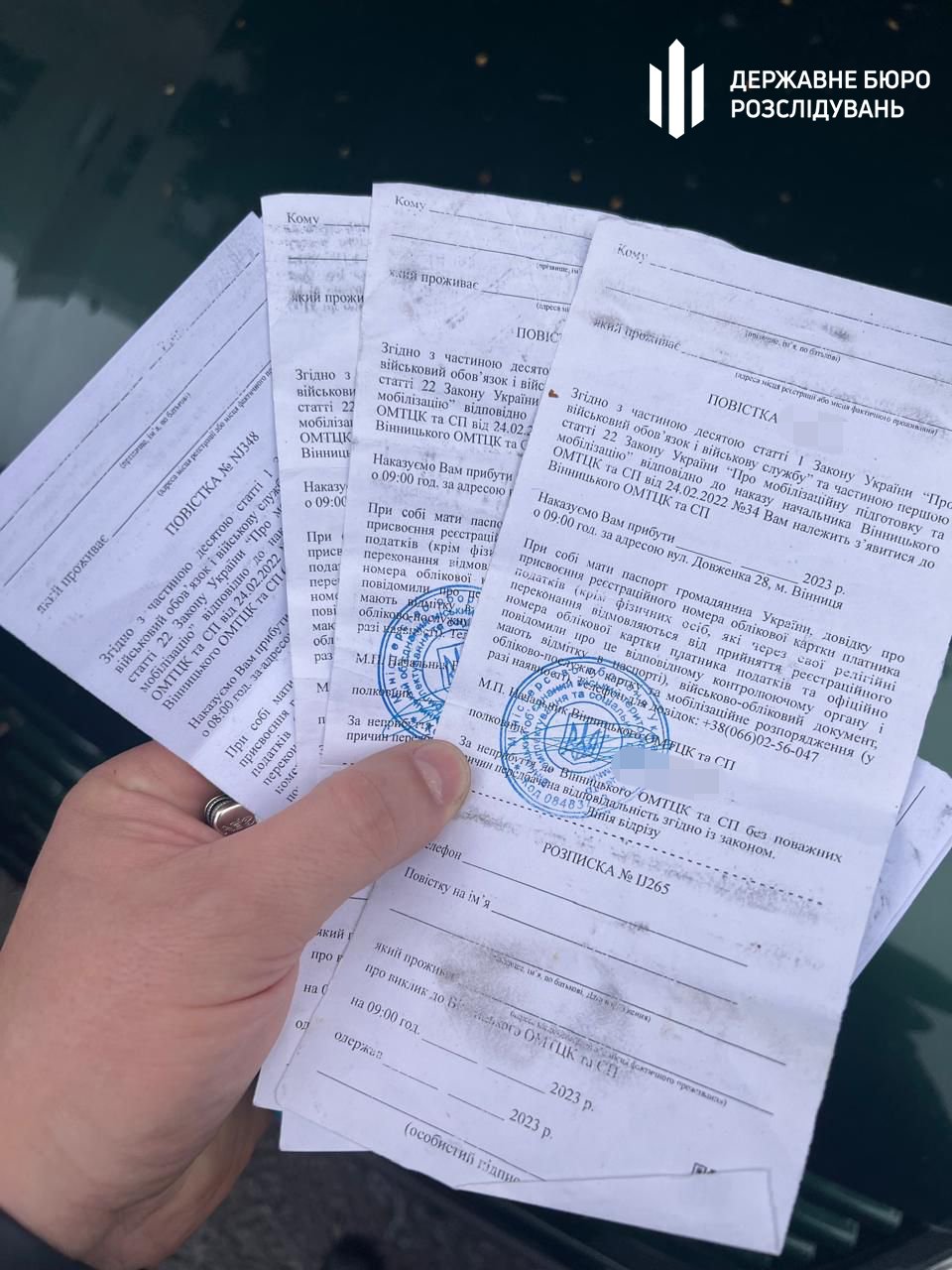 Співробітники Державного бюро розслідувань затримали сина начальника одного із відділень Вінницького об’єднаного міського Територіального центру комплектування та соціальної підтримки, який обіцяв за гроші місцевому мешканцю зробити документи для виїзду за кордон. Про це у вівторок, 18 червня, повідомили у пресслужбі ДБР.