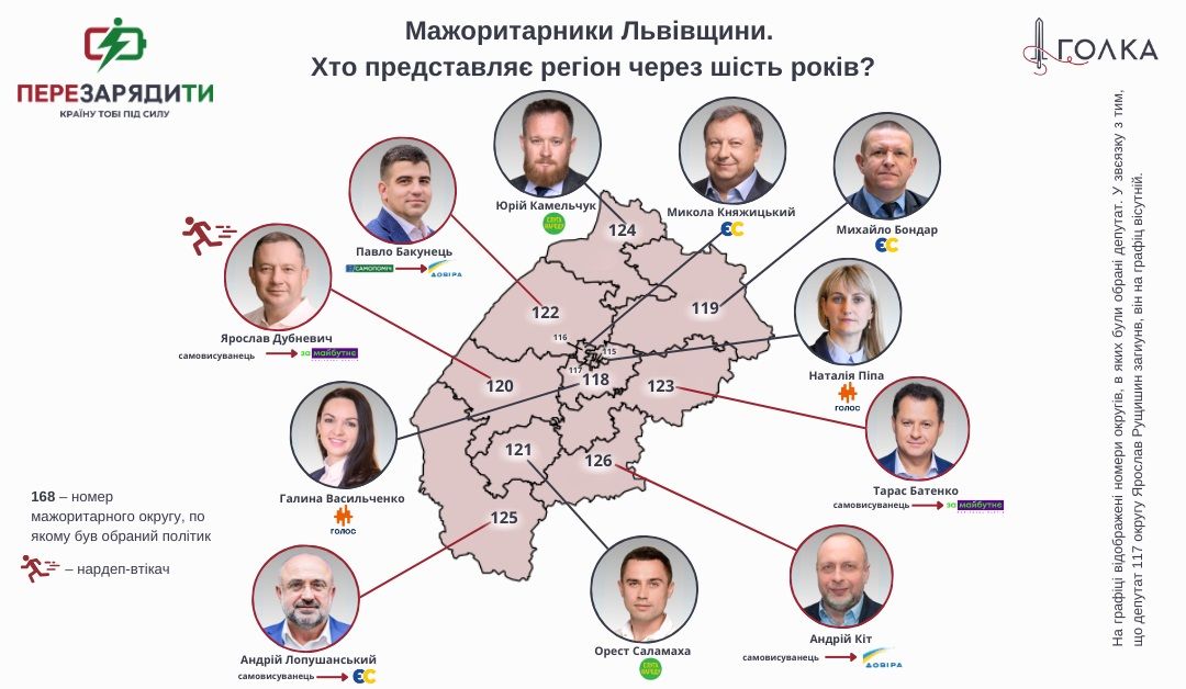 Але є й у Львова народні депутати, які потрапили у парламент за списком. Це зокрема Олег Синютка, який балотувався в мери Львова від «Європейської солідарності» та очільник осередку «Батьківщини» Михайло Цимбалюк. І якщо «Слуги народу» по суті програли майже всі округи в області на виборах 2019 року, то завдяки списку партії у парламент пройшло чимало представників Львівщини: Мар’ян Заблоцький, Святослав Юраш, Олена Копанчук, Євген Петруняк, Ростислав Тістик, Остап Шипайло.