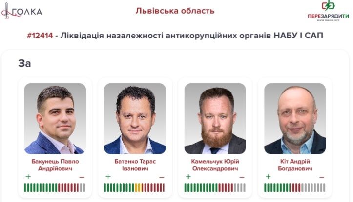 Закон про фактичну ліквідацію НАБУ і САП спричинив протести по всій Україні, зокрема й у Львові. Із 263 народних депутатів, які за нього проголосували, 11 є представниками Львівщини.