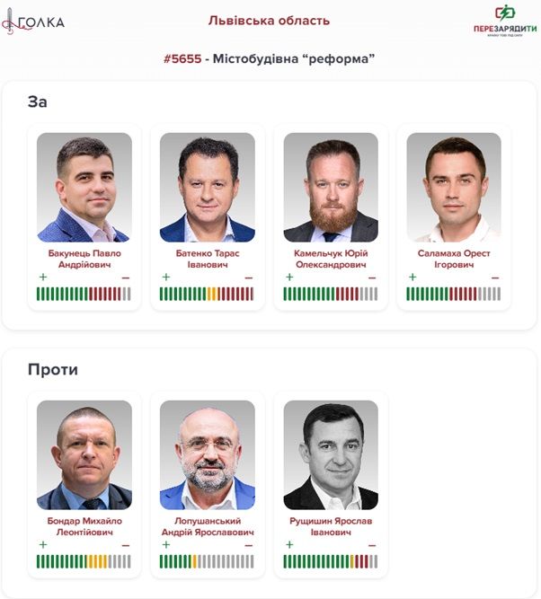 З-поміж мажоритарників Львівщини за скандальний проєкт проголосували Бакунець, Батенко, Кіт і Саламаха. Щодо Саламахи, то таке голосування виглядає цілком логічним, адже його родина пов’язана із будівельним бізнесом і будує у Сокільниках. Списочники, які голосували «за» – Заблоцький, Юраш, Петруняк, Копанчук, Цимбалюк та Олена Кондратюк.