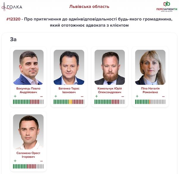 Винятком стало голосування Піпи за законопроєкт, який забороняє ототожнювати адвокат і клієнта (проєкт 12320). Закон прописаний так, що будь-якого громадянина можна буде притягнути до адміністративної відповідальності, якщо ця особа скаже, наприклад, фразу: «Олексій Шевчук був адвокатом Іллі Киви» або «Сердюк був адвокатом Януковича». Закон лобіювали адвокати державних зрадників, які захищали їх не просто у залі суду, а допомагали їм формувати інформаційне поле, а це вже не входить до сфери адвокатської діяльності.