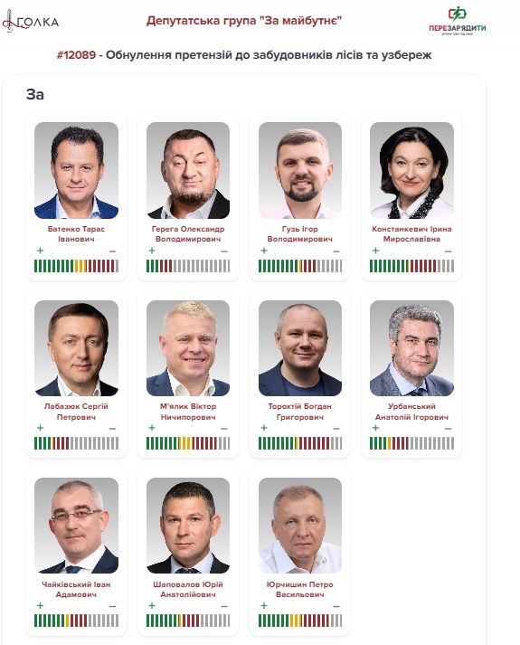 Окремо варто зазначити, що Львівщина делегувала у парламент голову депутатської групи «За майбутнє» – Тараса Батенка. Це політична партія, яку фінансував олігарх Ігор Коломойський і донедавна очолював Ігор Палиця. Саме з цими прізвищами пов’язують забудову Карпат, зокрема спробу побудувати курорт-монстр Свидовець. Тож не дивно, що коли розглядають скандальні законопроєкти, як містобудівна «реформа» чи «закон Ігоря Мазепи» народні депутати «За майбутнє» разом із Батенком голосують за такі питання.