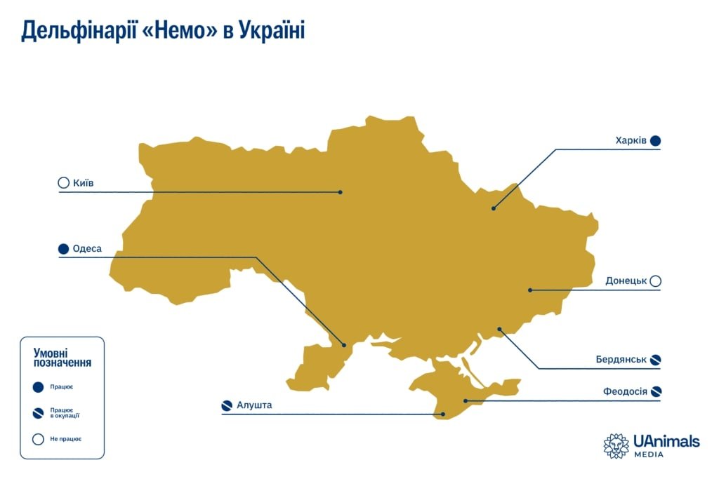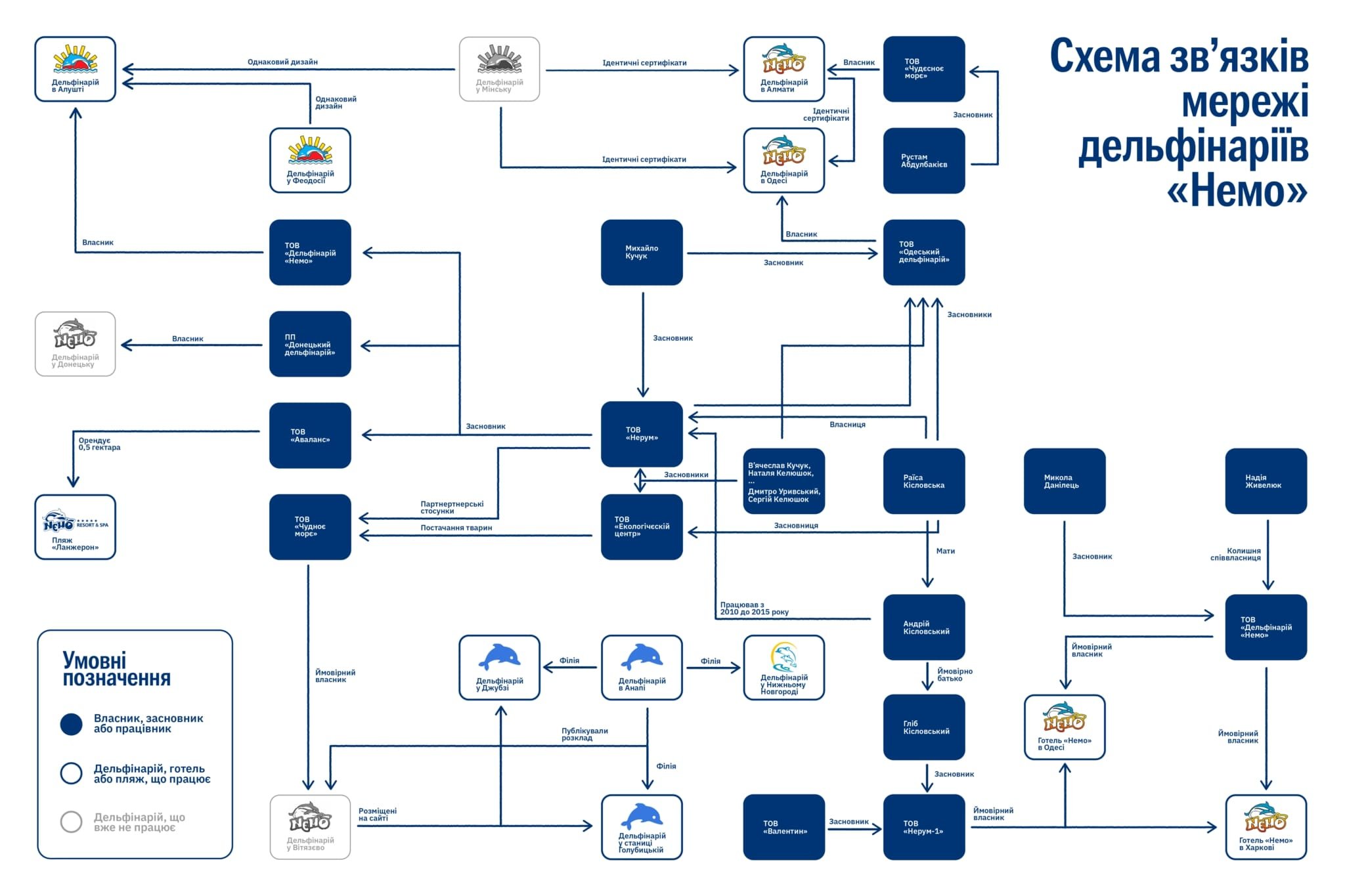 «У межах франшизи “Немо” має дельфінарії-філії в низці російських міст: Анапі, Нижньому Новгороді, Джубзі, станиці Голубицькій, Вітязєвому. Окрім цього, дельфінарій “Немо” тісно пов’язаний з іншими російськими компаніями. Передусім ідеться про “Чудноє морє”. З 2011 до 2013 року ця російська компанія мала партнерські стосунки з товариством “Нерум” і отримувала морських тварин за дорученням товариства з обмеженою відповідальністю “Екологічєскій центр”», – йдеться у розслідуванні.