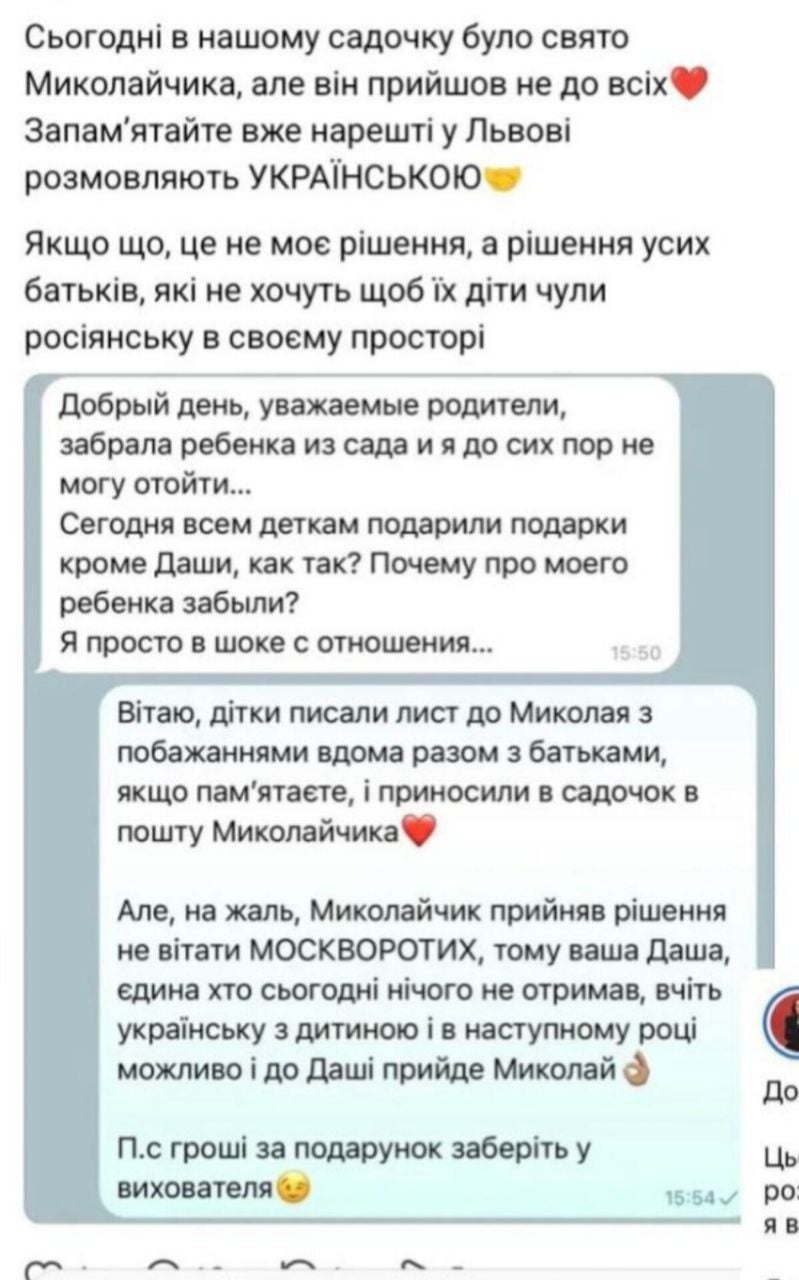 На каналі поширили скриншот переписки у телеграмі начебто з батьківського чату, де одна мама російською мовою скаржиться, що її доньці Даші в садочку не дали подарунка. На що їй відповіли, що «Миколайчик прийняв рішення не вітати московоротих» і порадили вчити українську, тоді «можливо, в наступному році і до Даші прийде Миколай».