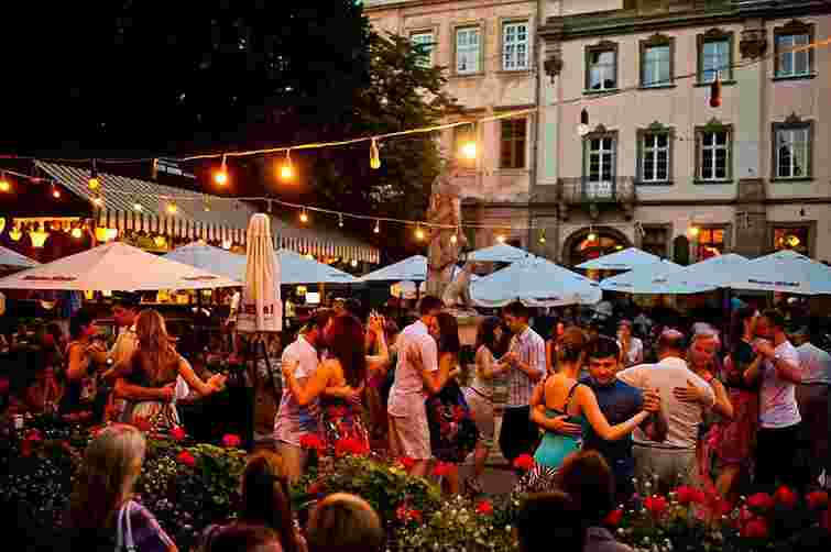 Львівський клуб танго «Люди вулиць» влаштовує традиційні недільні танці на площі Ринок біля фонтану Діани. Ще сто років тому в Європі цей танець вважався занадто відвертим, однак навіть заборони монархів не змогли зупинити зростання його популярності. Чуттєві рухи і ритми танго – це ідеальне завершення тижня.