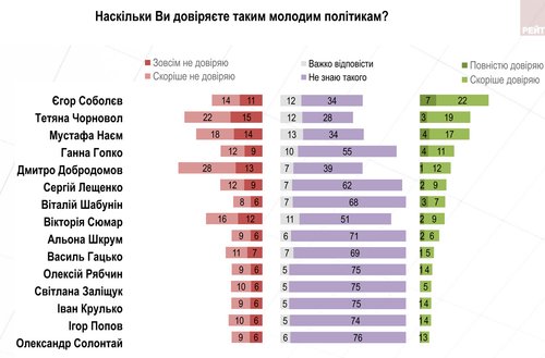 Так, народному депутату від «Самопомочі» Єгору Соболєву довіряють 29% опитаних, нардепу від «Народного фронту» Тетяні Чорновол - 22%, а нардепу з фракції «Блоку Петра Порошенка» Мустафі Найєму - 21%. Усім іншим молодим політикам довіряють менше 20% українців.