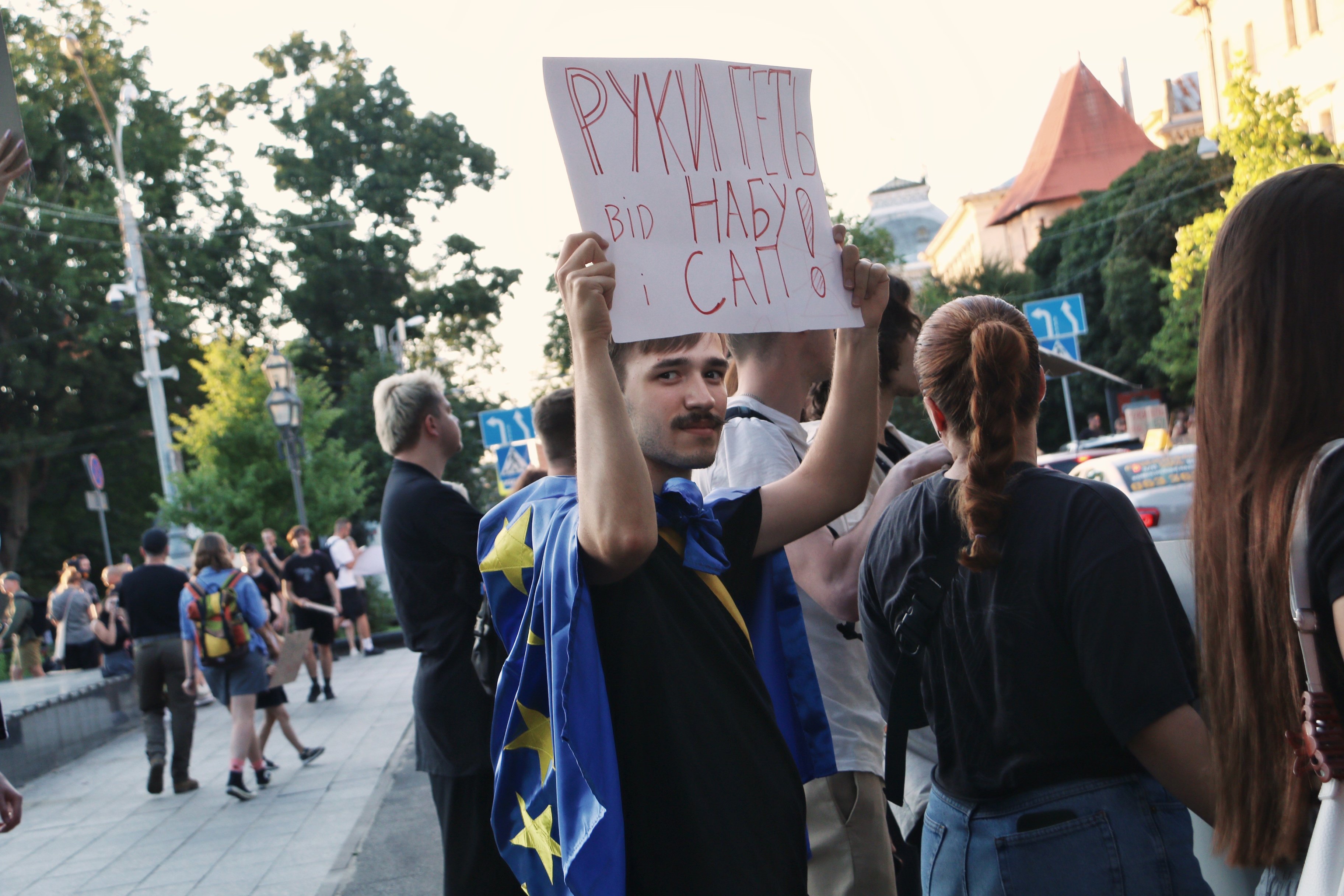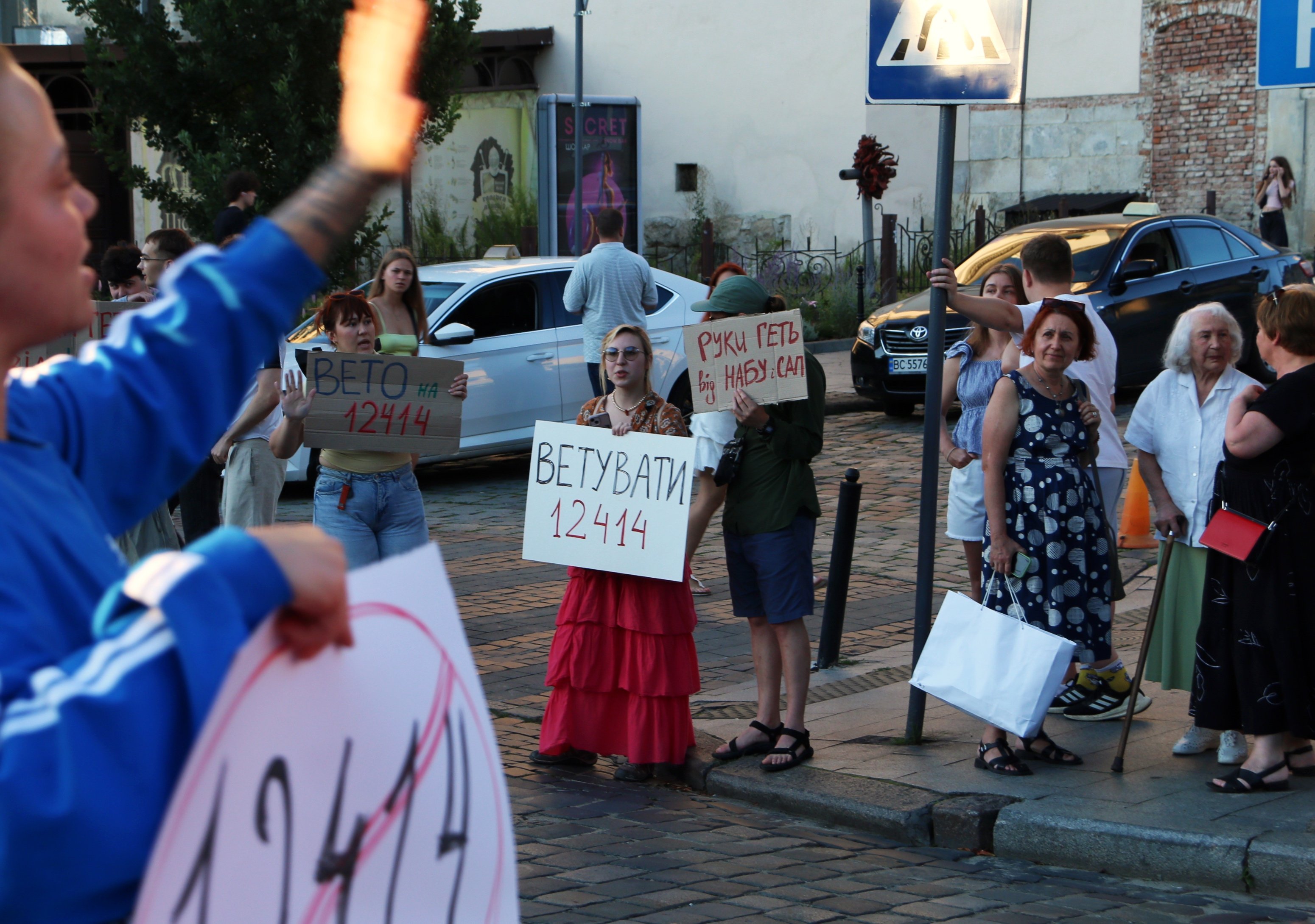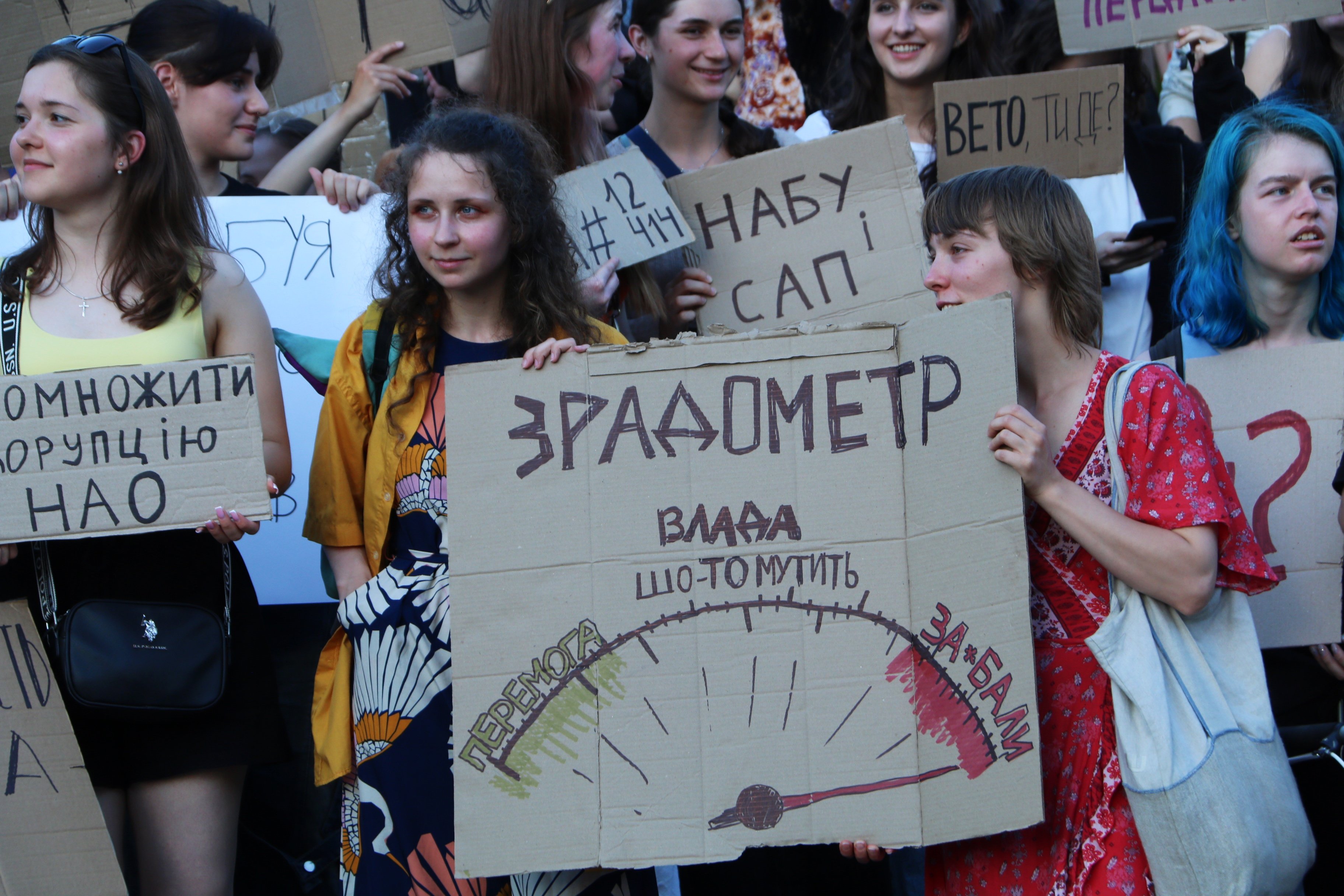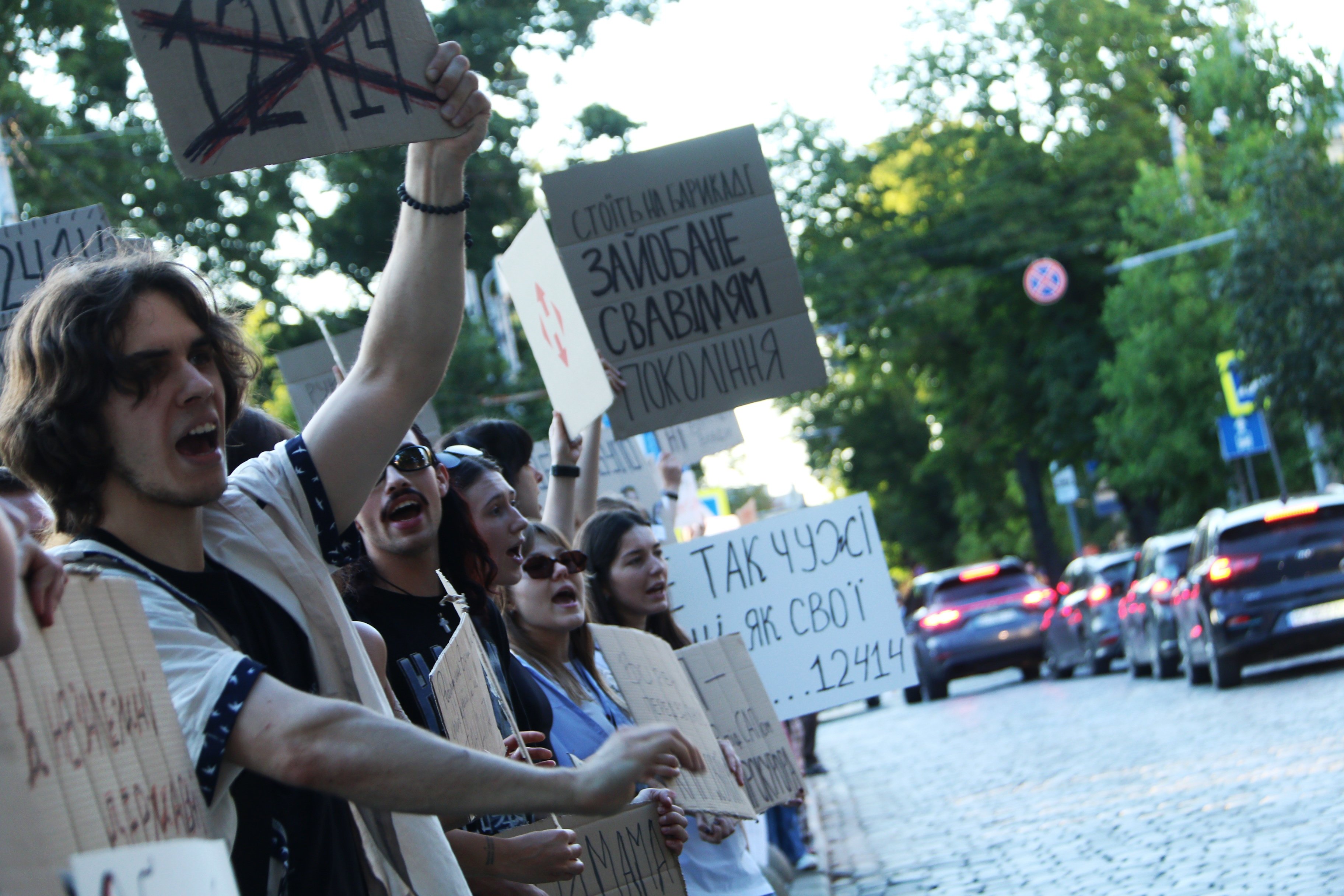 Також вони тримають плакати з написами «Русня вбиває, власна влада – добиває», «Демократія? Ні, не чули», «Руки геть від НАБУ і САП», «Владу – народу», «Україна – не автократія» тощо.