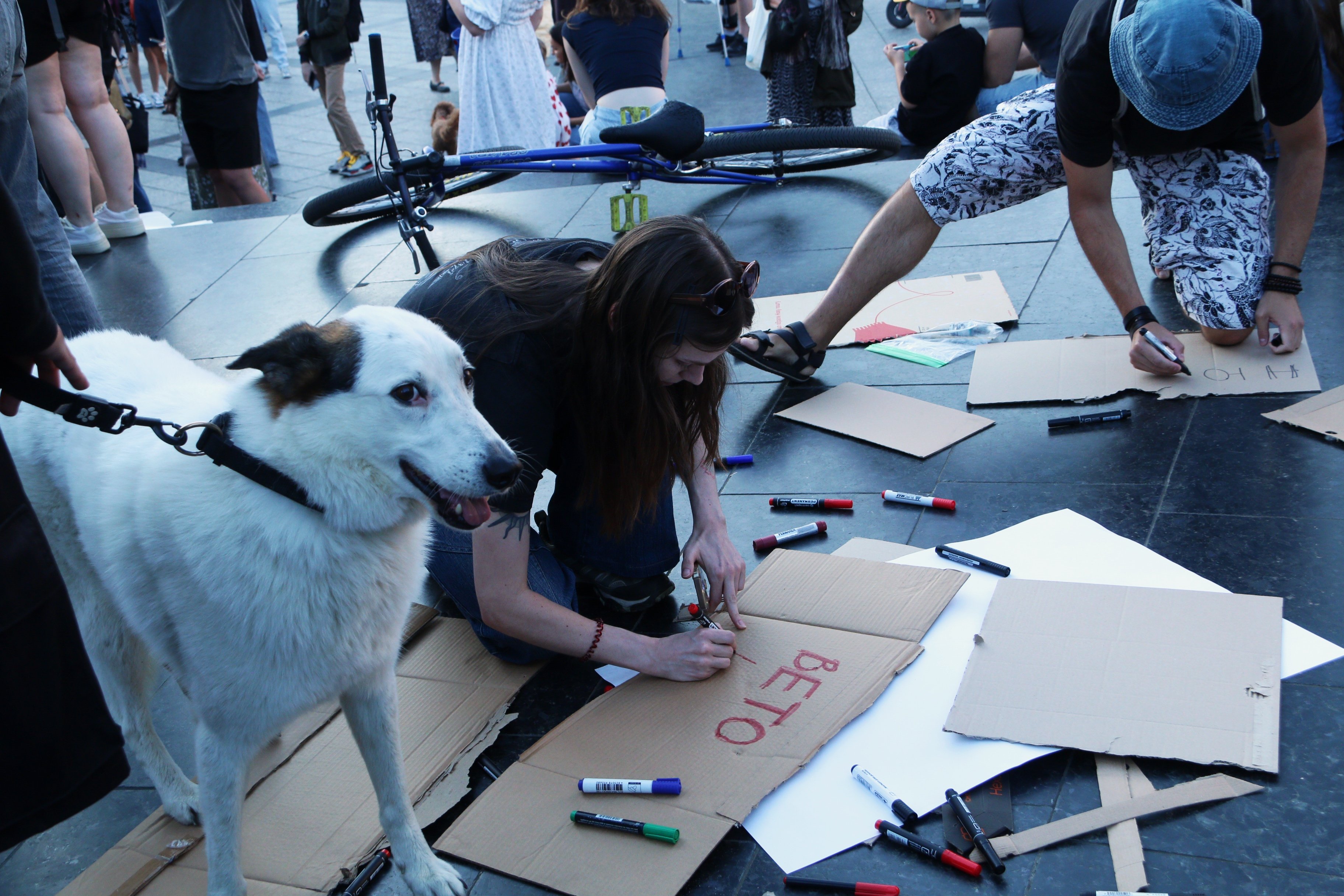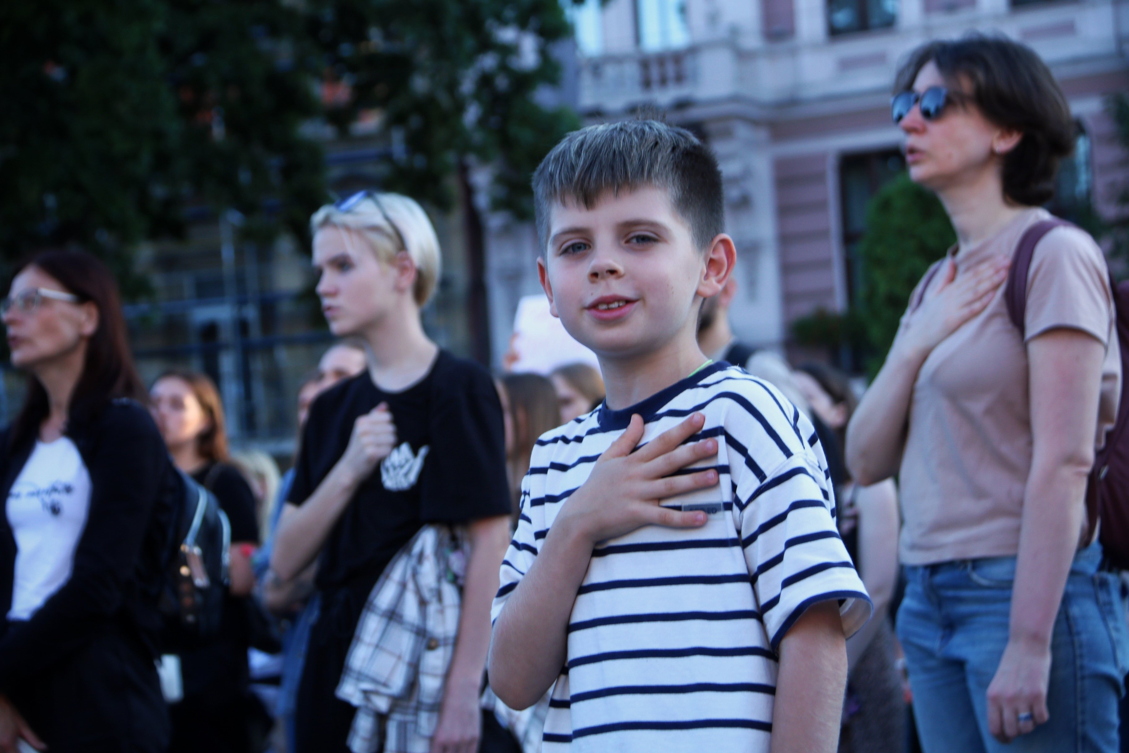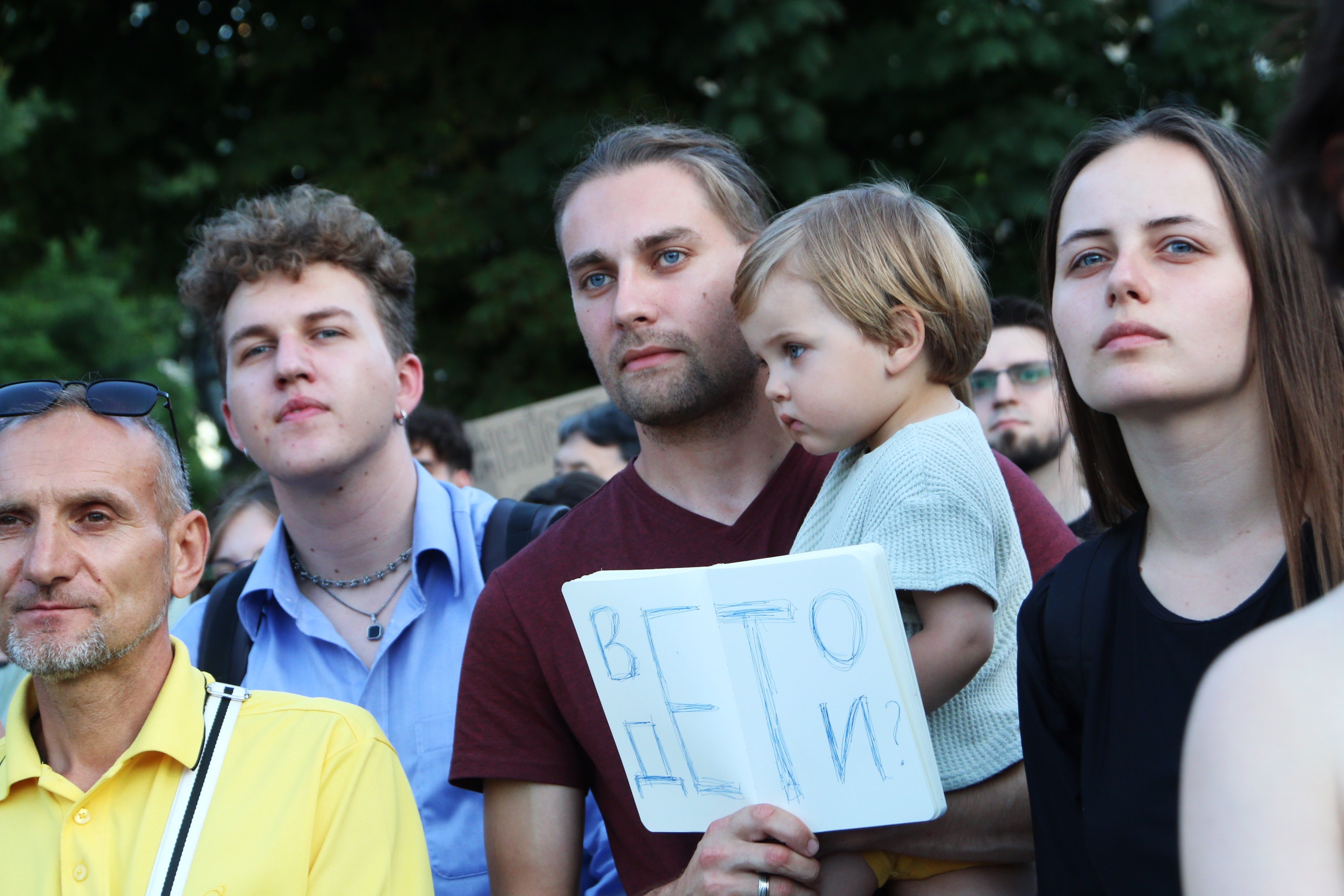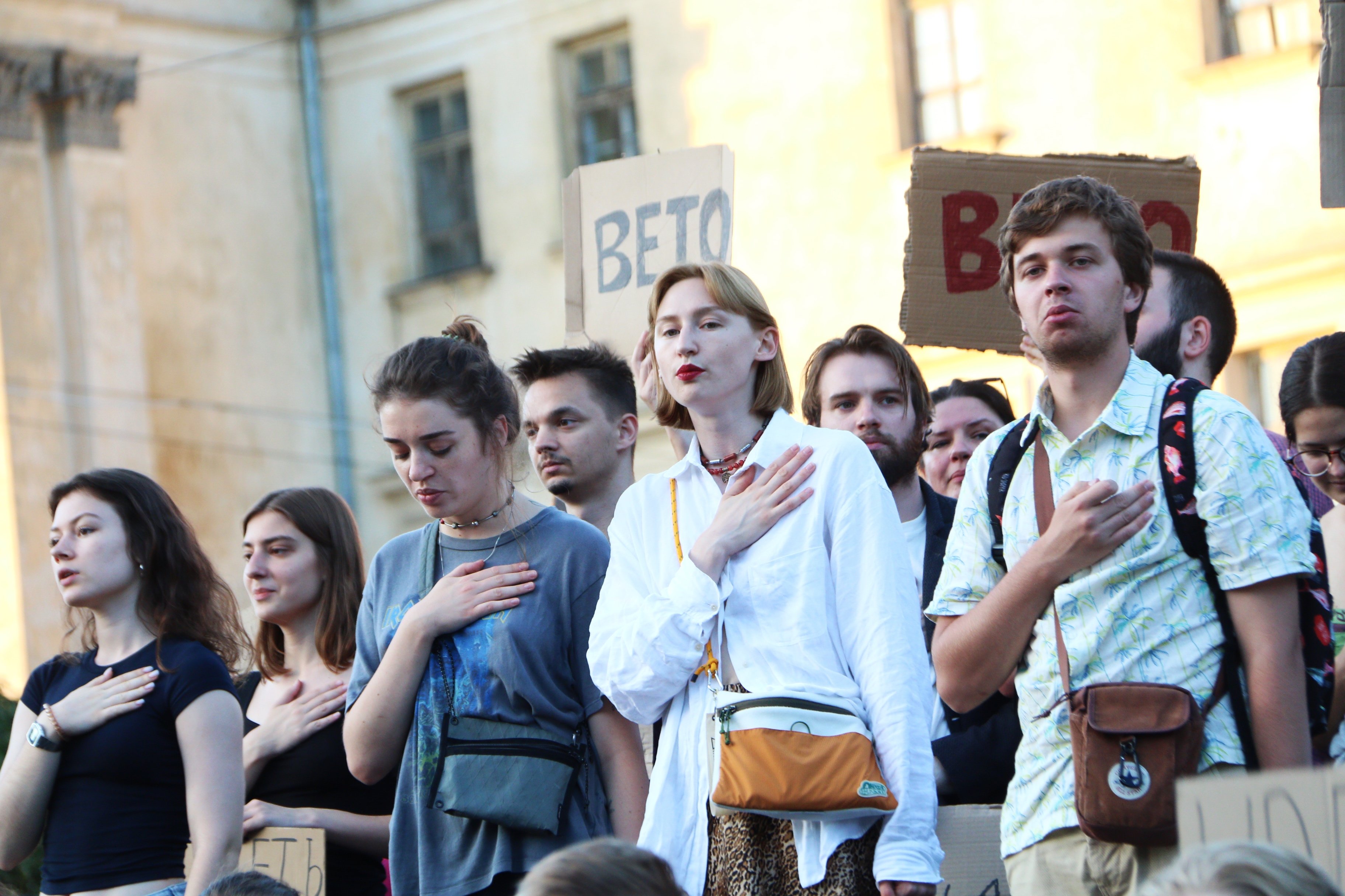 Також вони тримають плакати з написами «Русня вбиває, власна влада – добиває», «Демократія? Ні, не чули», «Руки геть від НАБУ і САП», «Владу – народу», «Україна – не автократія» тощо.