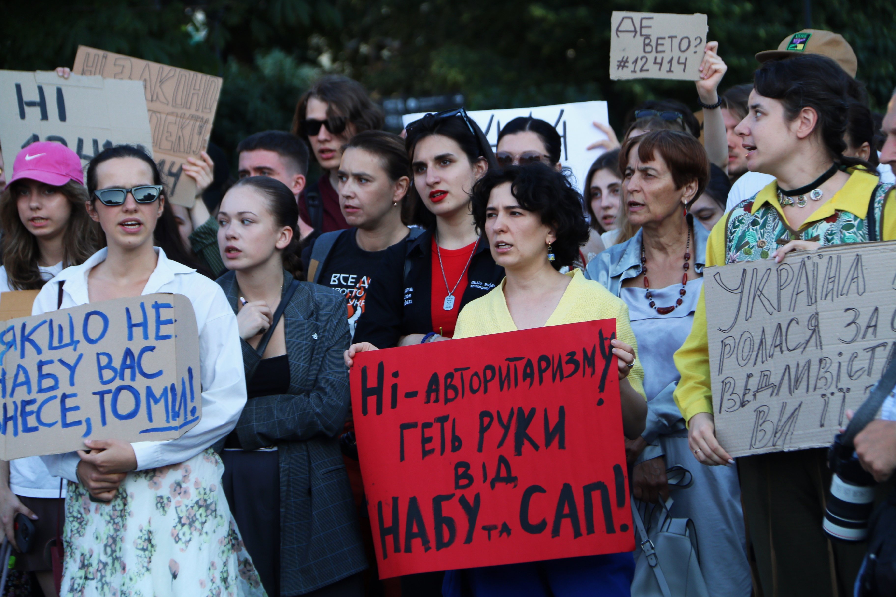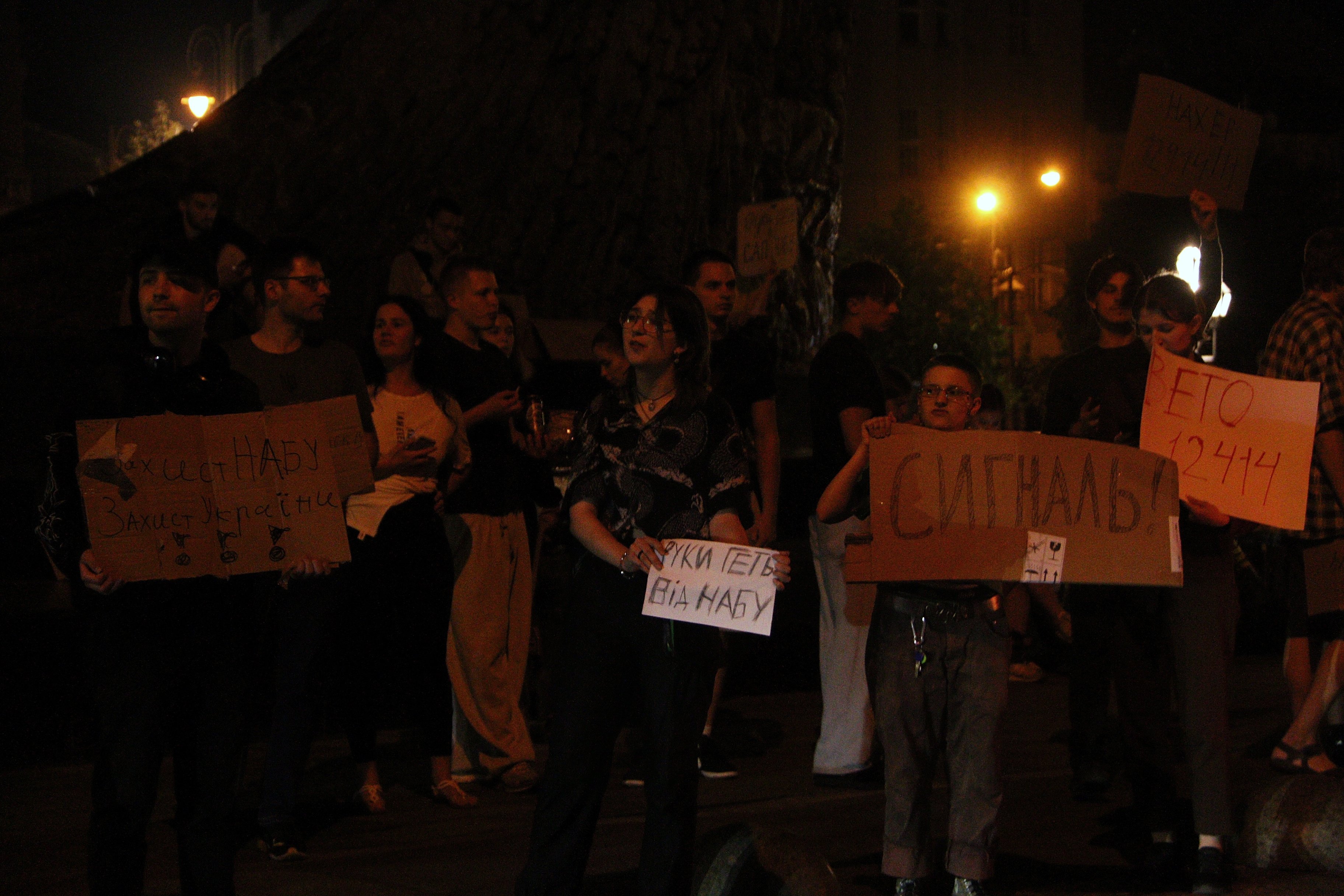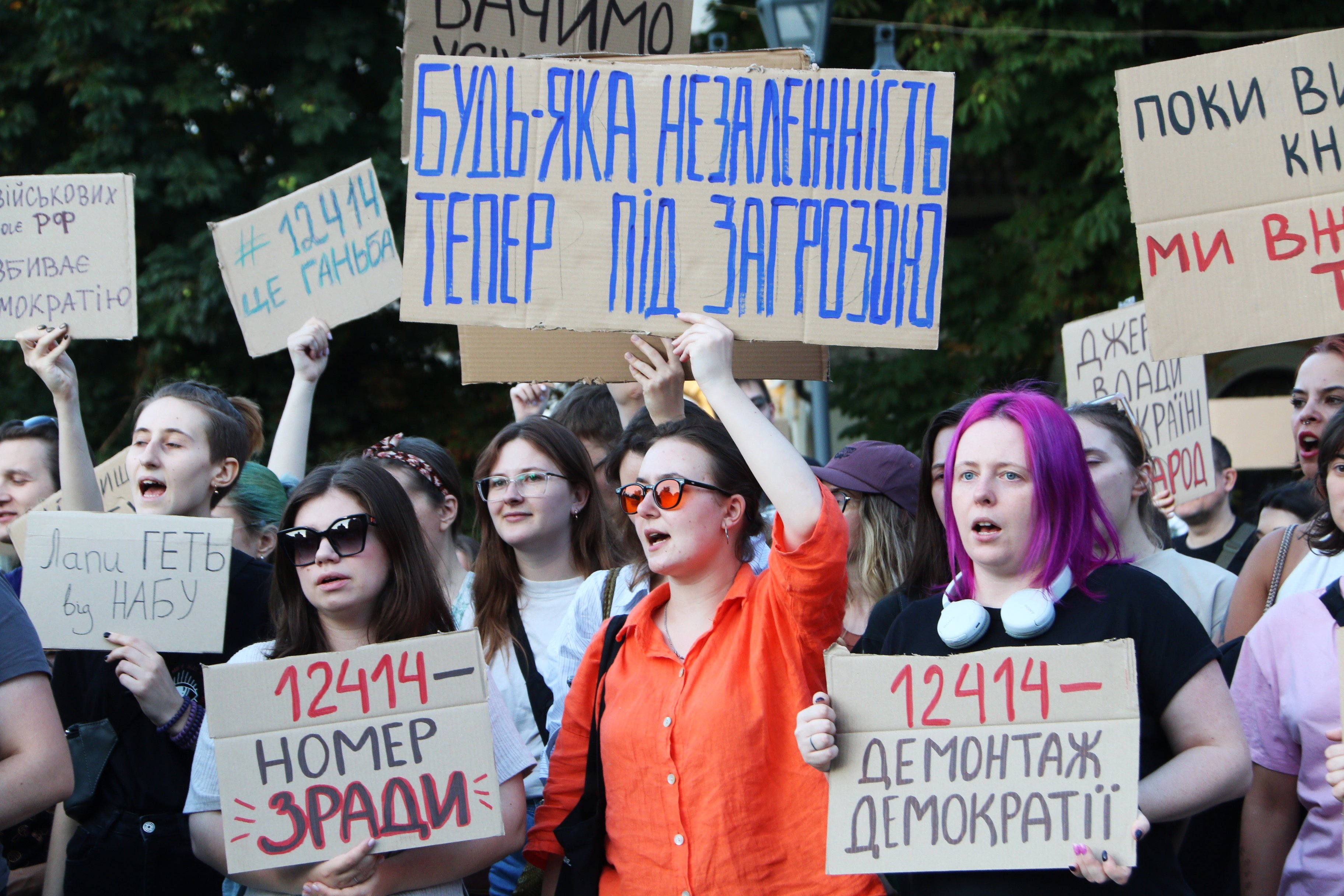 «Я сюди прийшла, щоби висловити своє категоричне невдоволення законом №12414, який обмежує незалежність САП і НАБУ. Я вважаю це загрозою нашій подальшій євроінтеграції, нашій незалежності та демократичності. Я думала, що влада на це не піде, але, здається, вони безстрашні, вони думають, що люди зараз перелякані, виснажені війною, неспроможні виходити на протести, показувати своє невдоволення. Тому, можливо, вони користуються цим становищем, щоби просувати вигідні для себе закони, щоби красти і ніхто їм не заважав», – прокоментувала ще одна учасниця акції протесту Христина Жук.