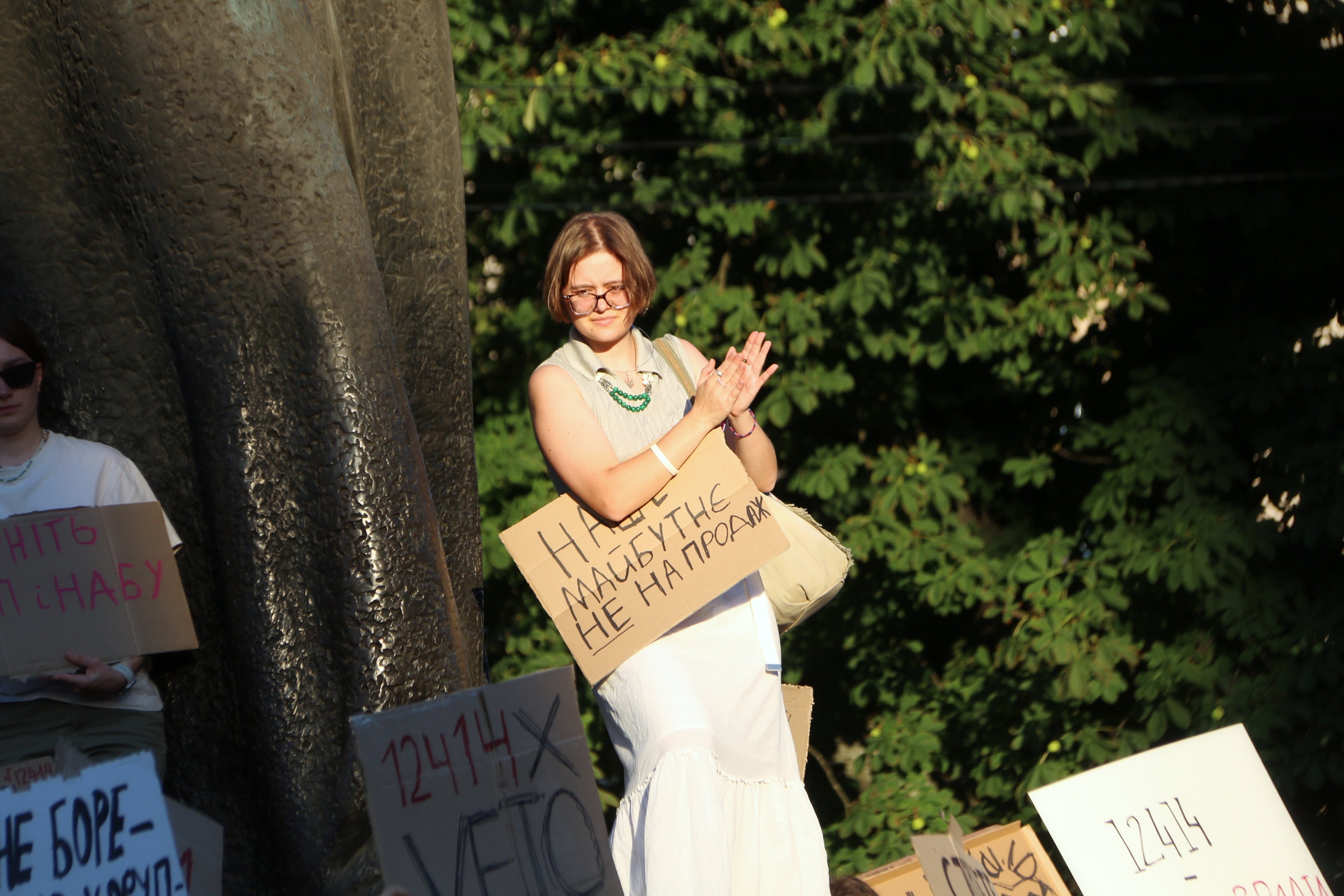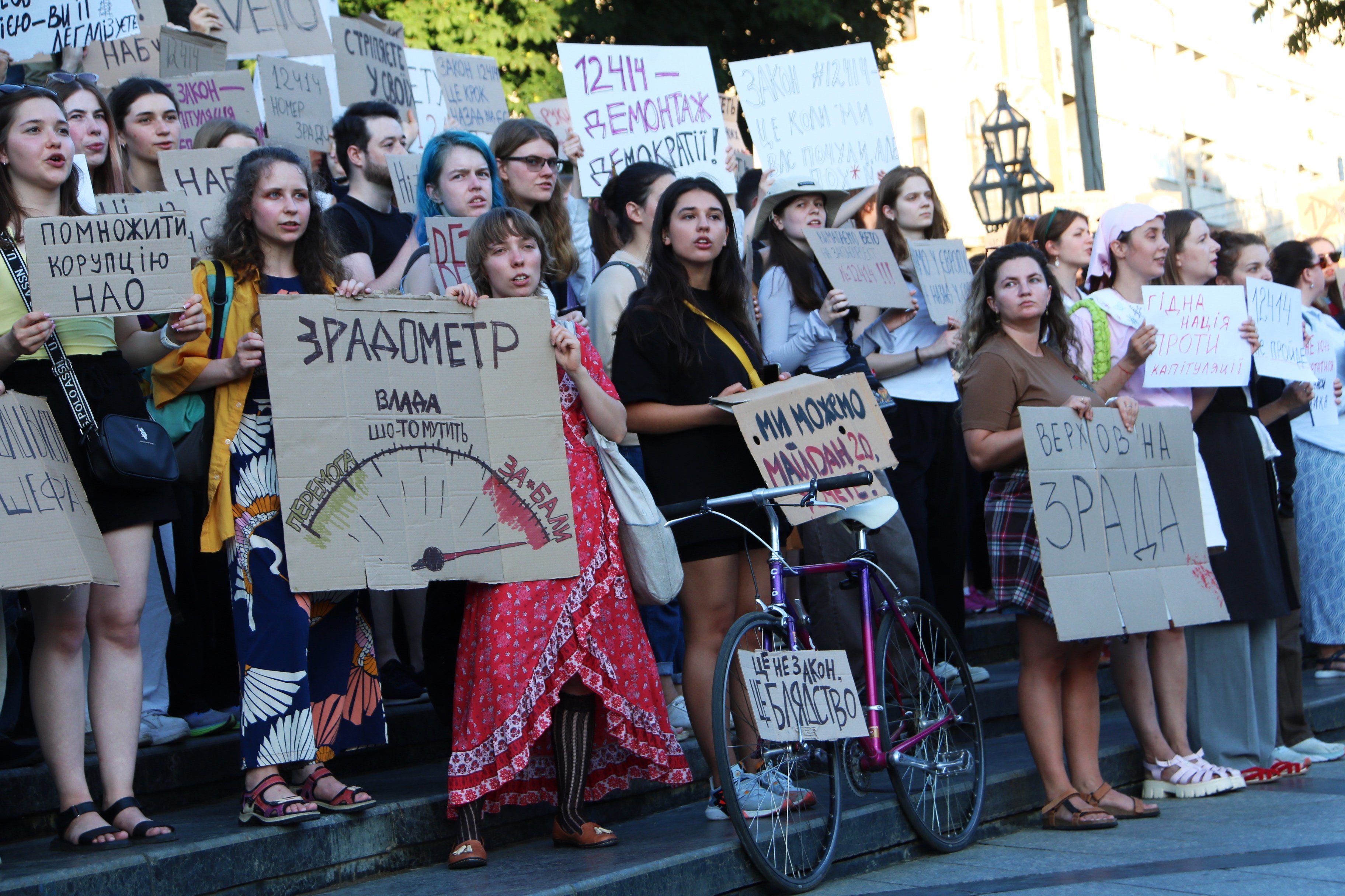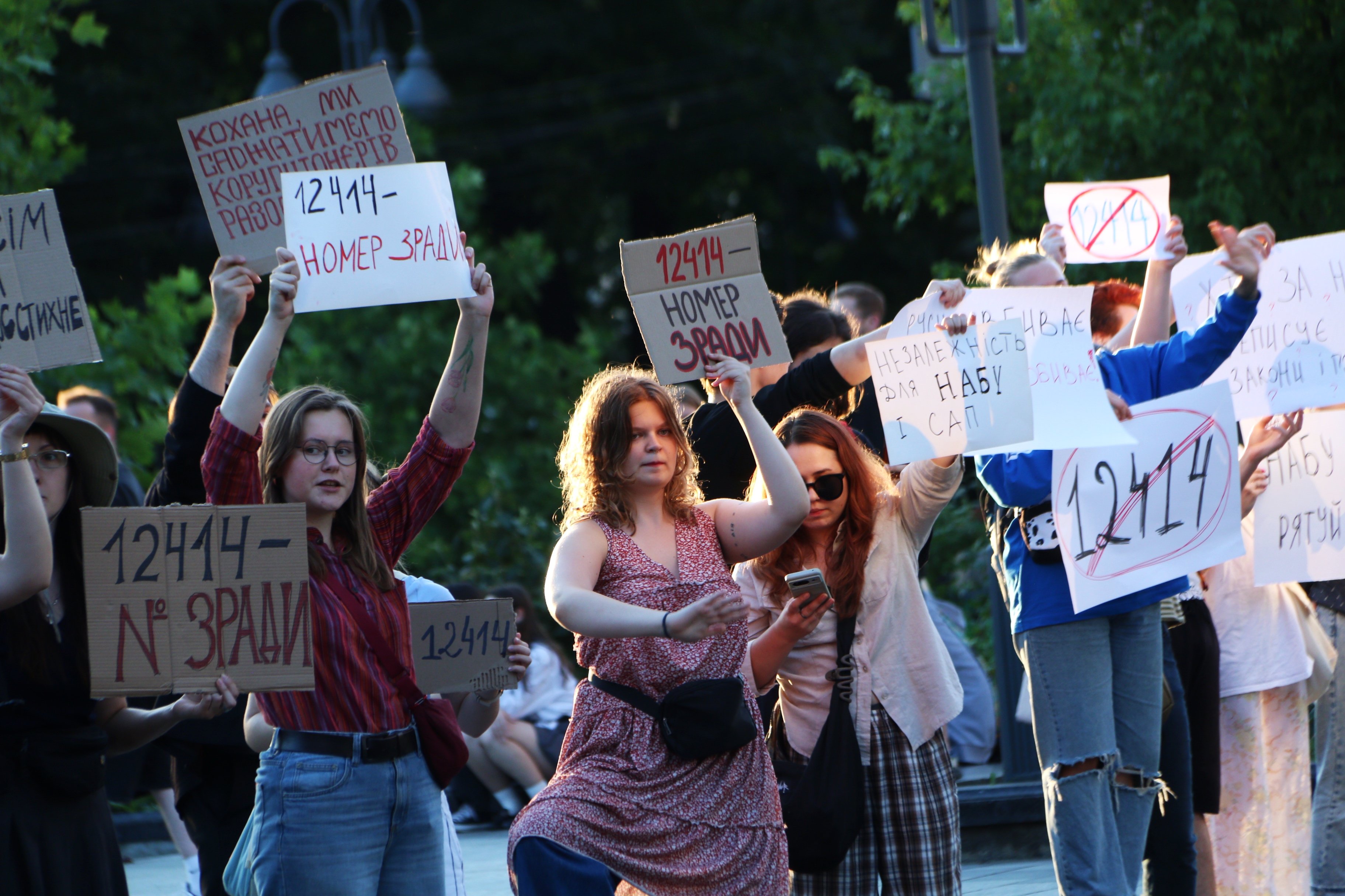 «Я сюди прийшла, щоби висловити своє категоричне невдоволення законом №12414, який обмежує незалежність САП і НАБУ. Я вважаю це загрозою нашій подальшій євроінтеграції, нашій незалежності та демократичності. Я думала, що влада на це не піде, але, здається, вони безстрашні, вони думають, що люди зараз перелякані, виснажені війною, неспроможні виходити на протести, показувати своє невдоволення. Тому, можливо, вони користуються цим становищем, щоби просувати вигідні для себе закони, щоби красти і ніхто їм не заважав», – прокоментувала ще одна учасниця акції протесту Христина Жук.