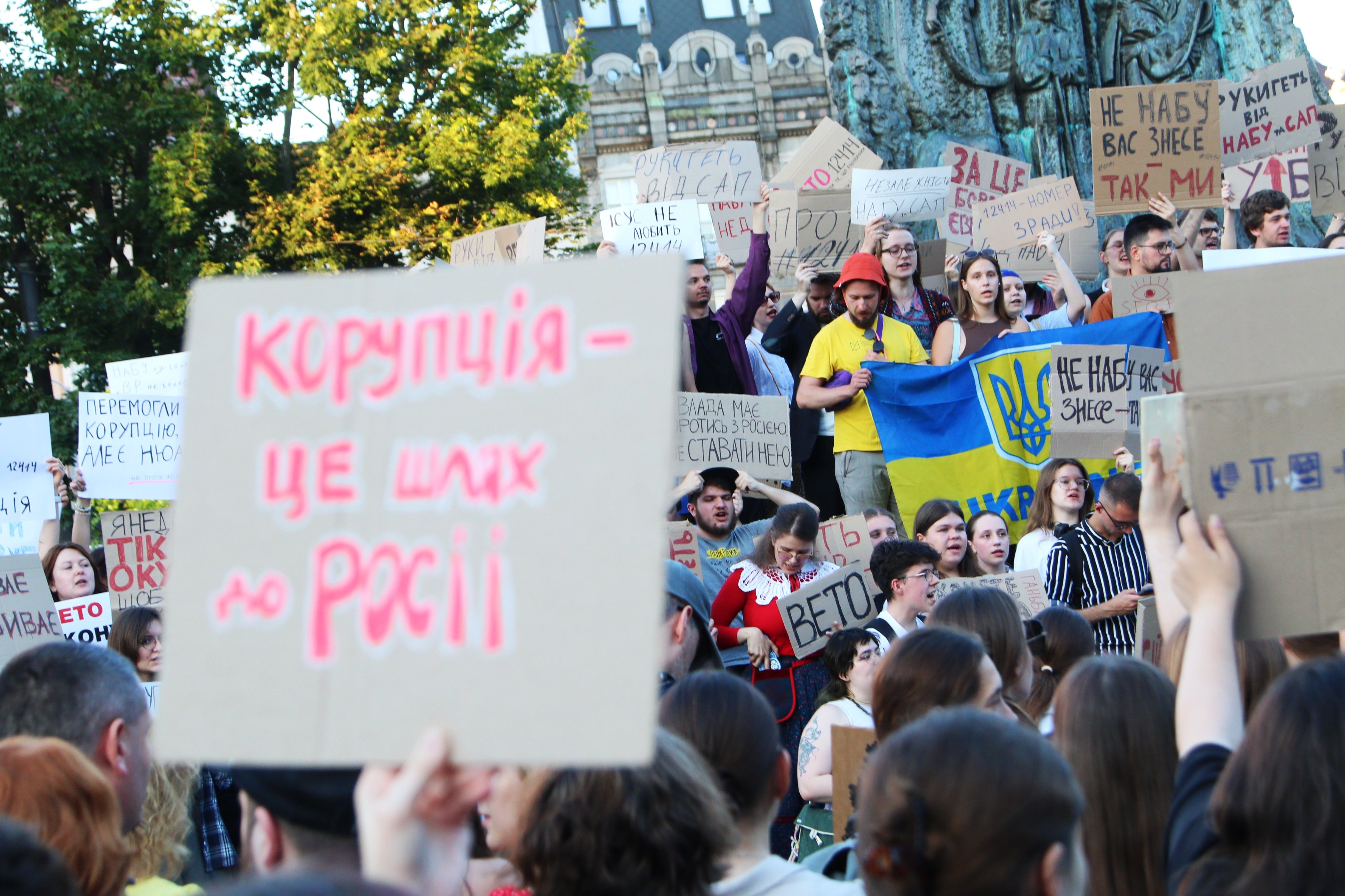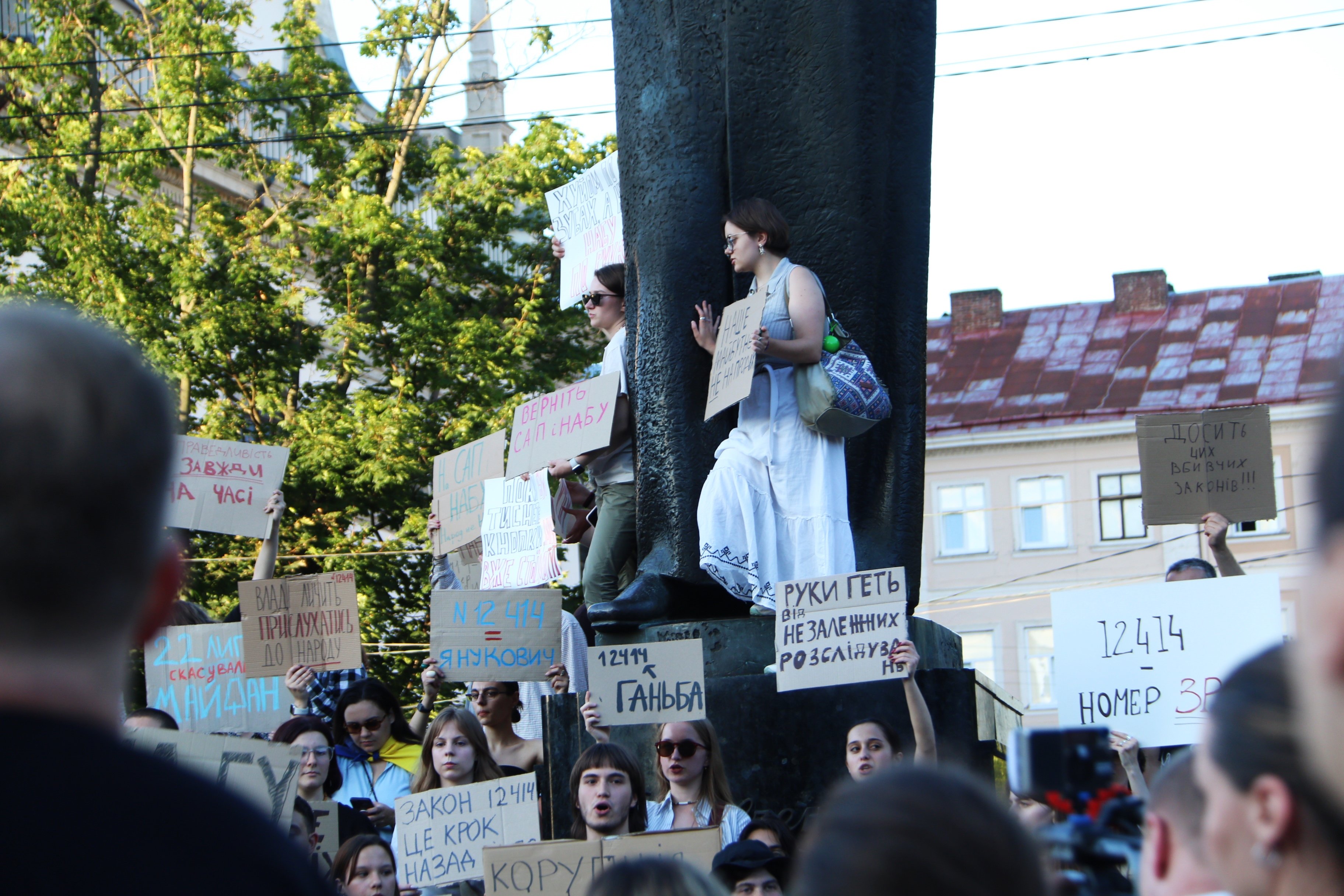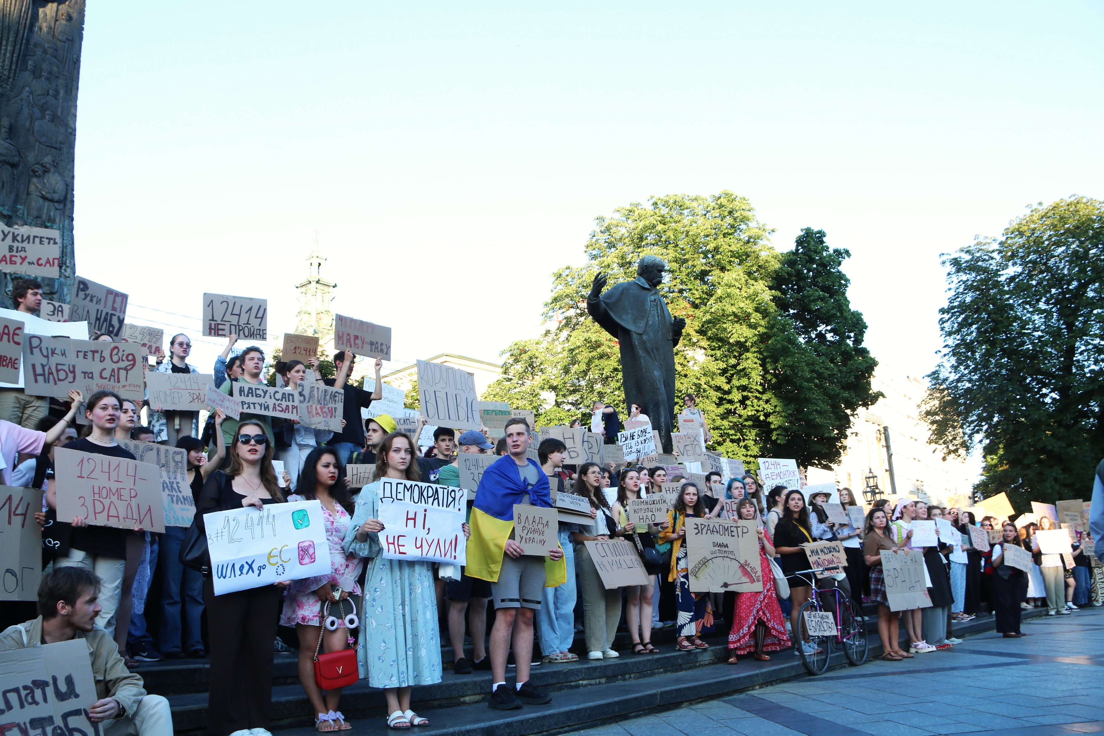 У вівторок, 22 липня, кілька сотень львів’ян зібралися на проспекті Свободи біля пам’ятника Тарасові Шевченку на протест проти скандального законпроєкту про ліквідацію САП і НАБУ, ухваленому сьогодні Верховною Радою. Про це повідомляє кореспондентка ZAXID.NET з місця подій.