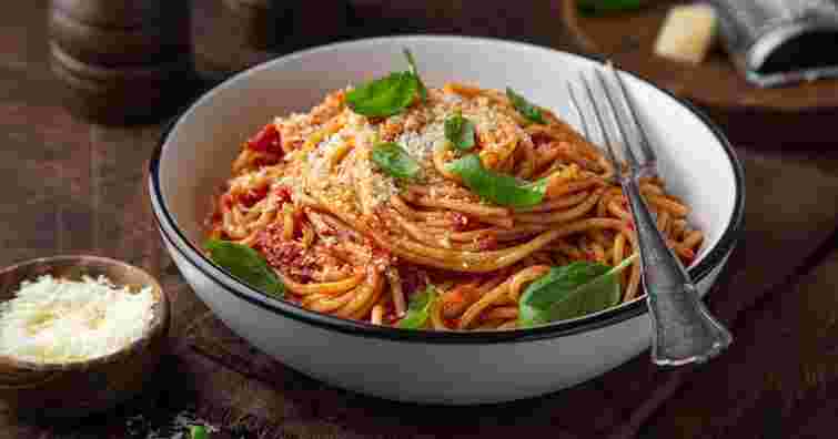 Додати спагеті та половину склянки води від них. Добре перемішати та залишити на вогні приблизно на хвилину. Якщо страва вийде надто густою, додати решту збереженої води. Подавати з тертим сиром (за бажанням) та листям свіжого базиліка.