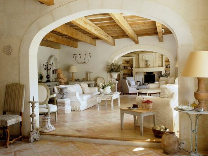 Штукатурка – найпоширеніший вид оформлення стін в стилі Прованс. Вона наноситься нерівно з грубими шорсткостями. Стелю в стилі прованс найчастіше роблять білого кольору або інших світлих відтінків. Якщо дозволяє висота стелі, ідеально підійдуть декоративні стельові балки, обшиті деревом світлих або середніх тонів.