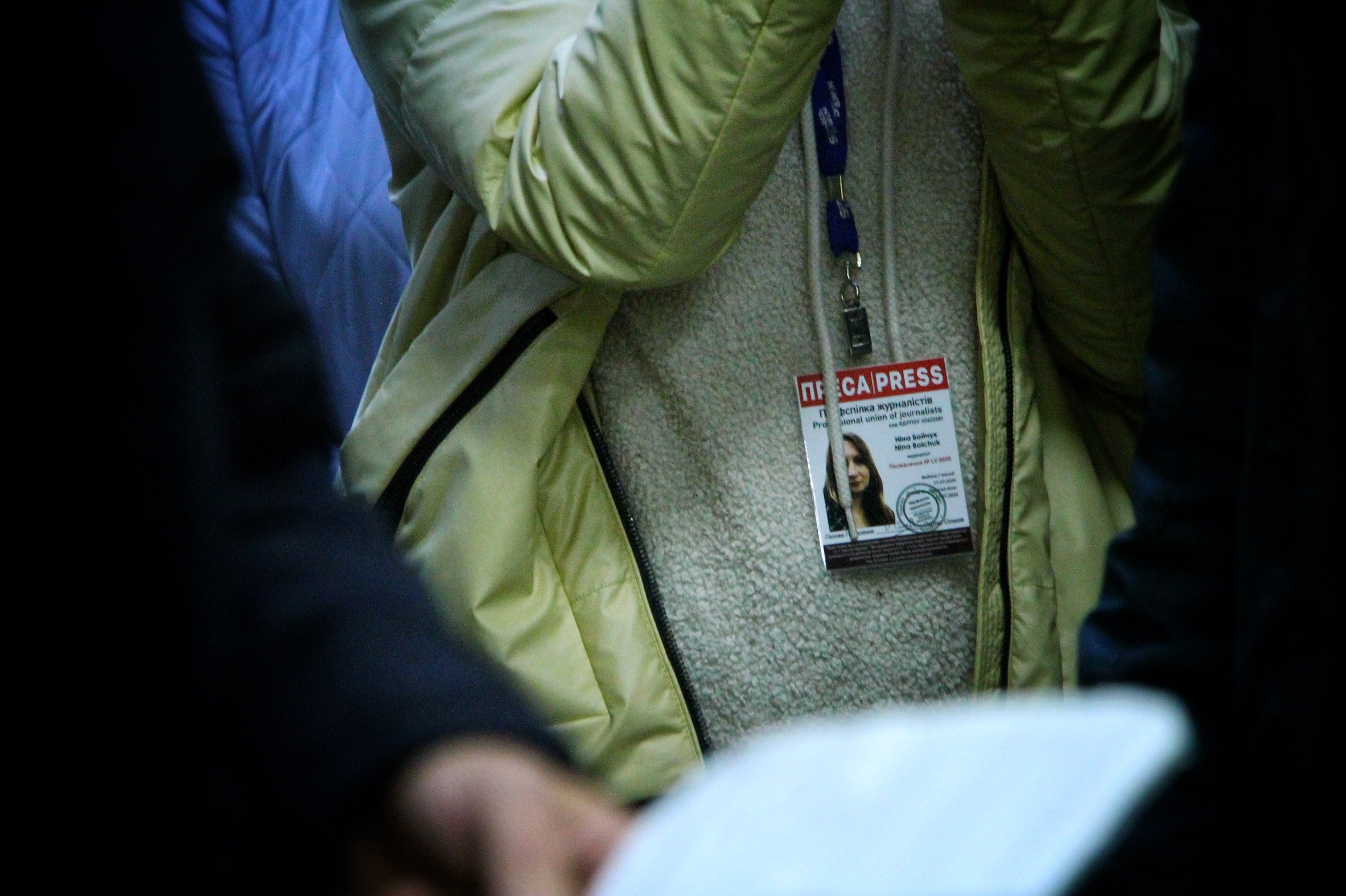 На шиї в Стахіва висить яскравий червоний бейдж, який він називає «посвідченням народного журналіста». У кількох його прихильників видніються такі ж «документи». Стахіву лестить увага, він активно жестикулює перед камерами. Згодом йде до свого місця під час засідання й дорогою жінка в дермантиновому пальті падає йому в обійми. Вона усміхається, стає сміливішою і після цього намагається телефоном впритул знімати обличчя журналістів.