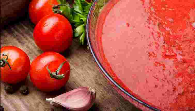 5-6 очищених помідорів (для цього їх потрібно на кілька хвилин занурити в окріп) розрізати на четвертинки та тушкувати хвилин 10 у власному соці разом з нарізаними цибулею та селерою, потім протерти крізь сито або розбити блендером.
