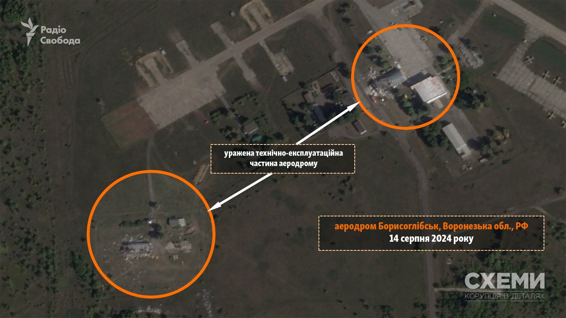 З’явились знімки наслідків ударів українських БПЛА по військовому аеродрому Борисоглєбськ у Воронезькій області Росії. Відповідні знімки опублікували журналісти проєкту «Схеми» в середу, 14 серпня.