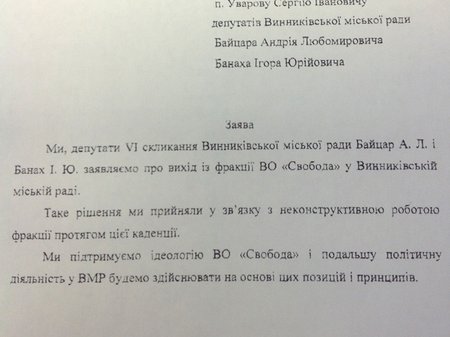 Депутати Винниківської міської ради Андрій Байцар та Ігор Банах вийшли з фракції ВО «Свобода». Відповідну заяву вони написали на ім’я міського голови Сергія Уварова, копію якої ZAXID.NET отримав у Винниківській міській раді у відповідь на інформаційний запит.
